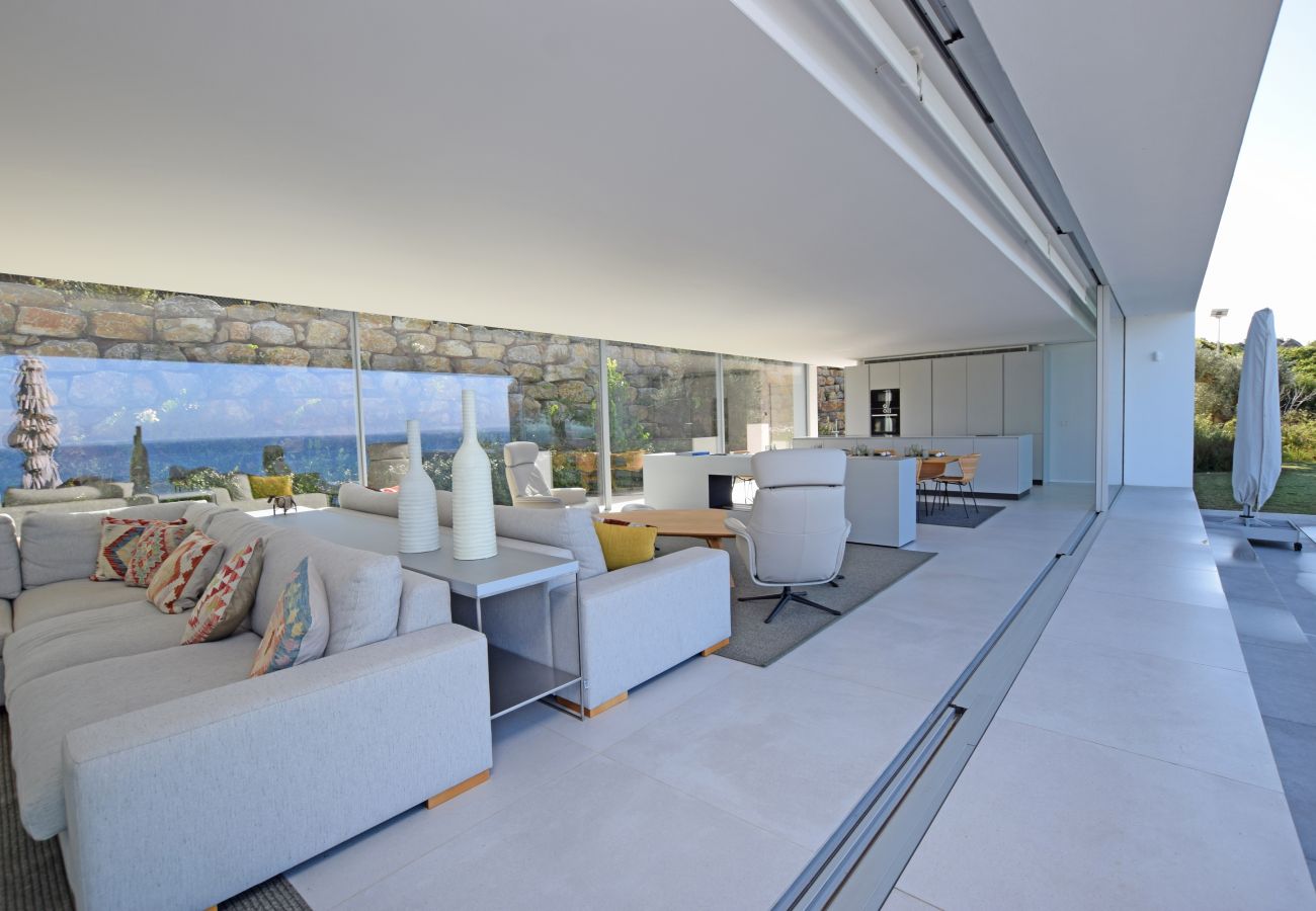 El salón-comedor es un espacio amplio y luminoso de 17 metros de largo. Las cristaleras se abren casi por completo, integrando el interior con la terraza, para que disfrutes de una experiencia fluida entre ambos espacios mientras contemplas el mar. La cocina abierta está equipada con todo lo que necesitas, incluyendo dos lavavajillas, dos neveras, cocina de inducción BORA y una mesa para 10 personas.