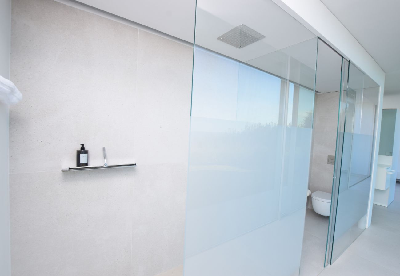 Elegancia y Naturaleza en Armonía. La planta alta de la villa alberga cuatro de los dormitorios, dos de ellos con baño en suite, mientras que los otros dos comparten un baño de diseño. Las enormes cristaleras que dominan esta planta ofrecen unas vistas espectaculares: por un lado, el mar y, por otro, una escollera de piedra decorada con buganvillas y jazmines, rodeada de frutales. Despierta cada mañana con la brisa marina y la sensación de dormir al aire libre gracias a los grandes ventanales que se pueden abrir completamente.