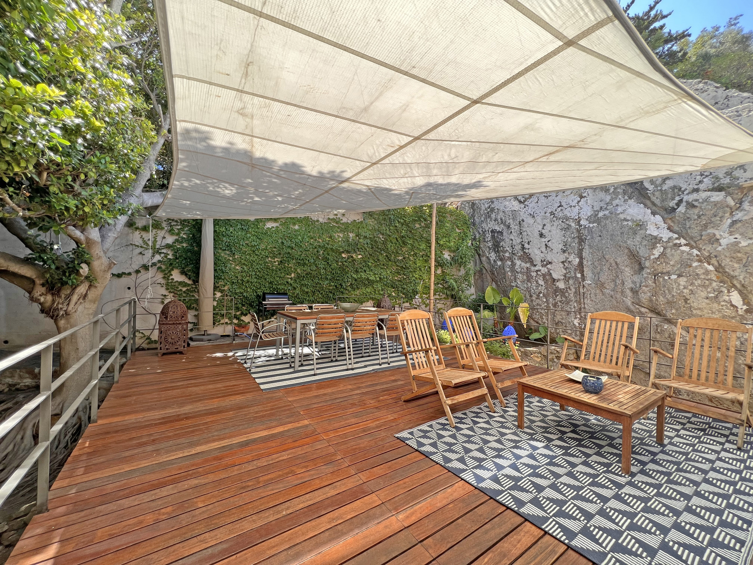 Este espacio acogedor y rodeado de rocas y un árbol centenar es ideal para las horas de calor y muy privado.