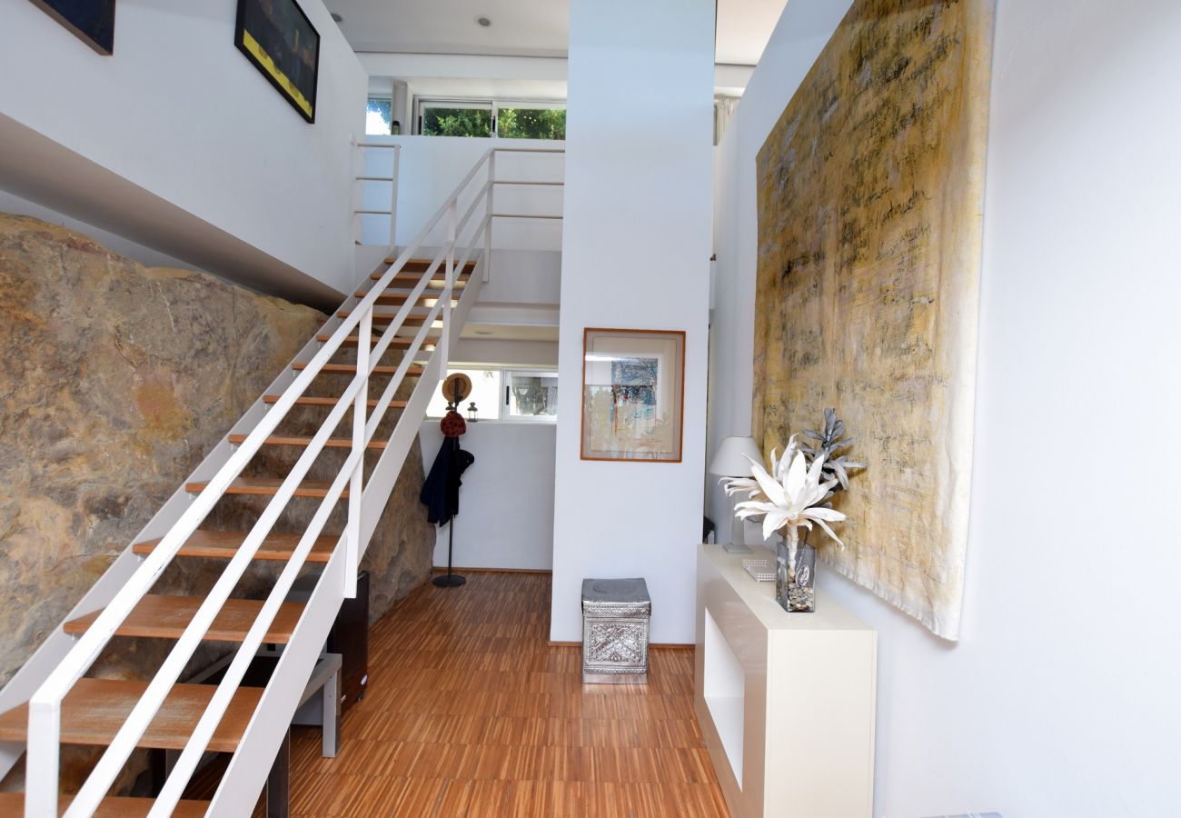 La vivienda cuenta con dos accesos. Uno desde el parking situado en planta sótano, en el que se encuentra un dormitorio doble con baño en suite, cuarto de lavandería y escaleras de acceso a la planta principal. Y la otra entrada nos da acceso directamente a un luminoso salón con paredes de cristal, con zona de estar, comedor, cocina americana totalmente equipada, y un aseo de cortesía.