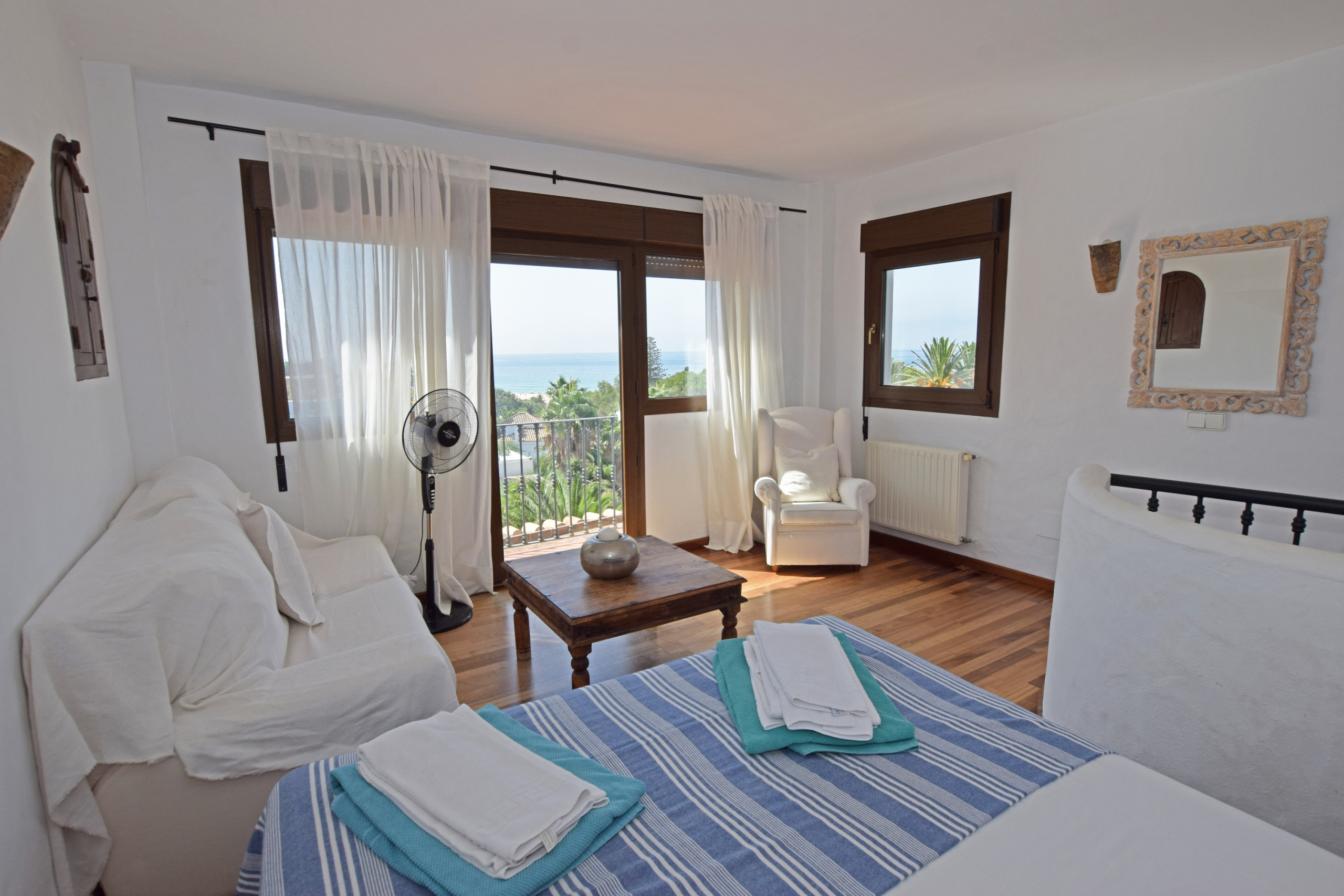 En la segunda planta tiene un tercer dormitorio con otra cama doble, muy espaciosa, con un balcón con vistas al mar.