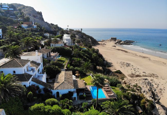 A orillas de la conocida playa del Búnker en Atlanterra, Villa El Peñón se esconde tras una prominente roca en la arena y luce integrada en primera línea con vistas infinitas al Estrecho de Gibraltar.