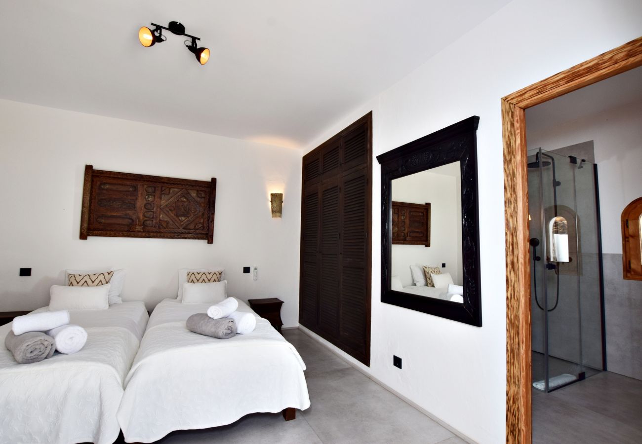 Si subimos por la escalera de caracol ubicada en la entrada, accederemos a la planta superior donde encontramos la suite principal con aire acondicionado que cuenta con un espacioso baño y un cómodo vestidor. Además de ello, la habitación principal disfruta de un balcón con magníficas vistas y de una zona de terraza resguardada del viento.