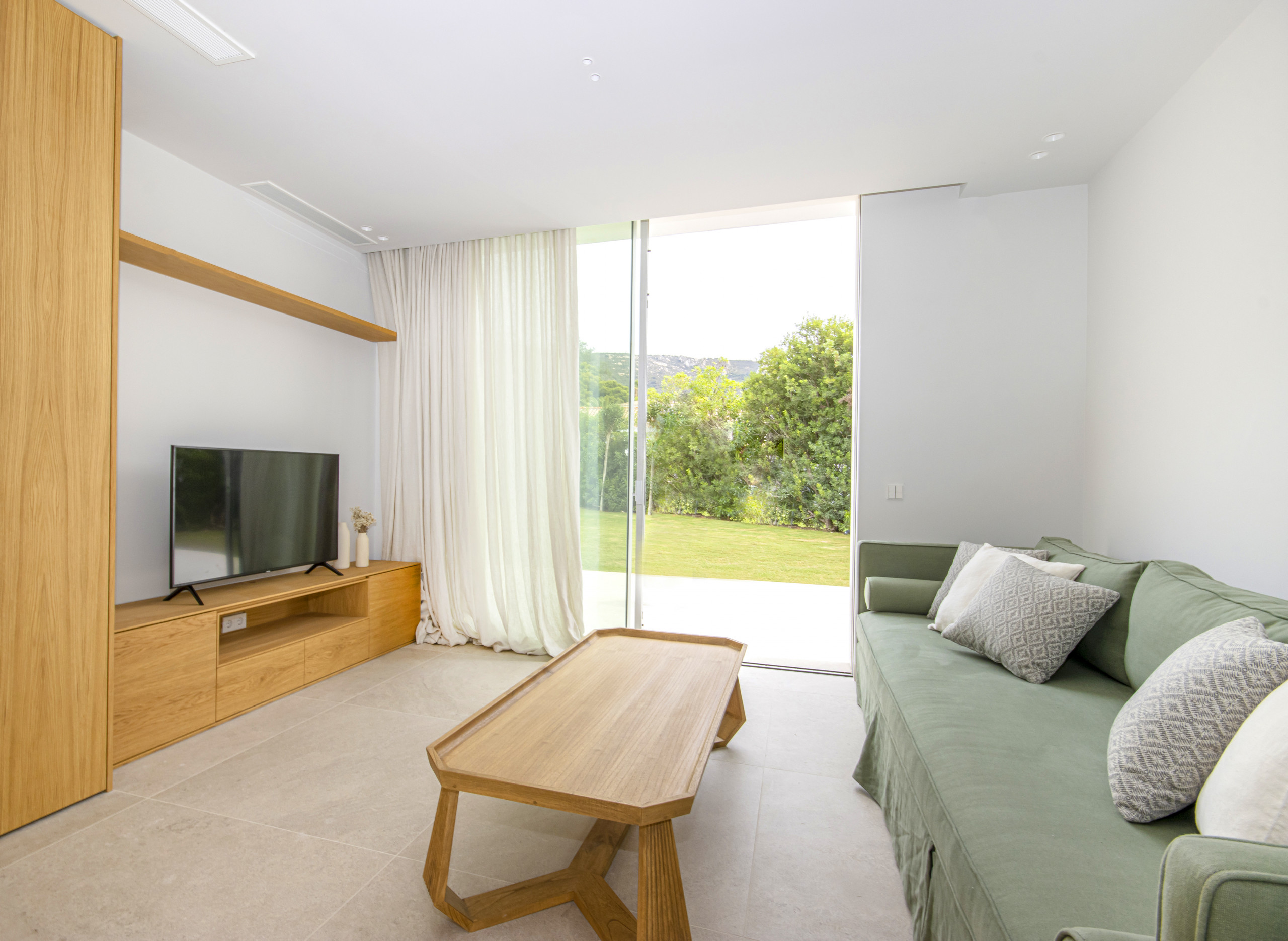 Una vez dentro de la casa, es inevitable notar el carácter acogedor que proporcionan los contrastes de madera, vegetación y mobiliario. La entrada nos dirige al frente a un amplio y luminoso salón del cual es imperativo destacar el jardín japonés con bambú natural, el agradable salón con chimenea, la amplia zona de comedor y la acogedora sala de estar con vistas al Faro Camarinal.