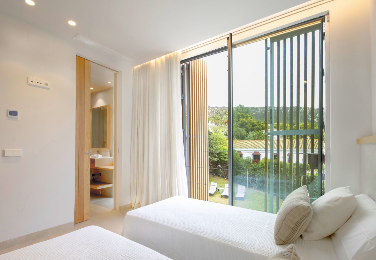 En el ala Oeste de la vivienda encontramos un pasillo acristalado que da acceso a la izquierda al porche y al fondo a una zona independiente de la vivienda con tres habitaciones dobles, una de ellas con baño en-suite y las otras dos con baño compartido completamente equipado. El porche puede cerrarse gracias a unos toldos verticales instalados en los tres arcos de acceso a la zona de piscina; el amplio espacio ofrece múltiples oportunidades para su distribución y funcionalidad.
