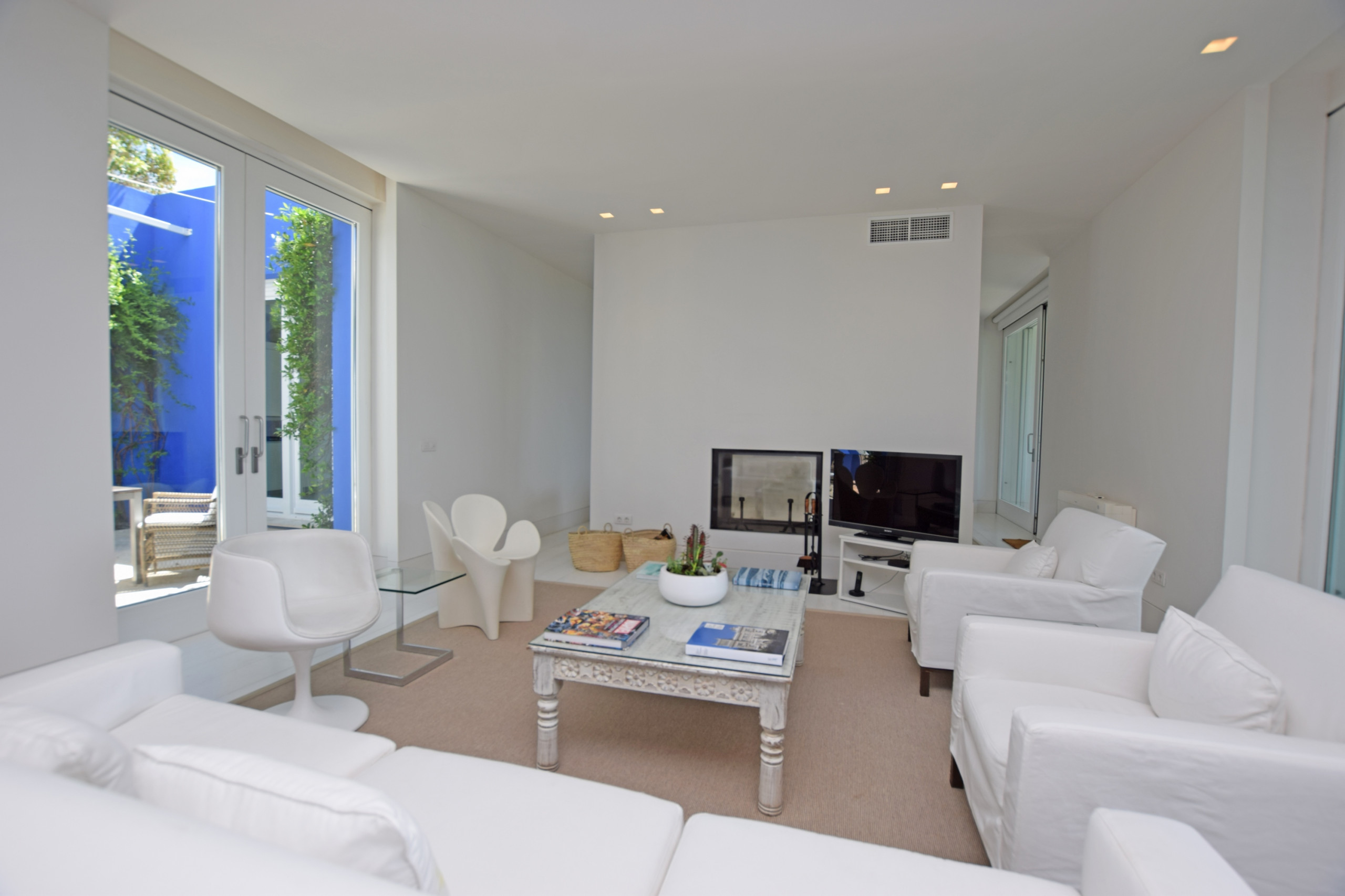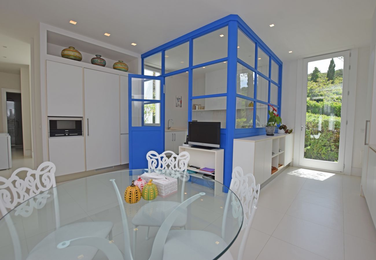 El comedor, comunicado con la cocina y presidido por una gran mesa redonda, se aísla de la zona del salón mediante una pared medianera que encastra una chimenea acristalada. Dicho salón, con diferentes alturas de techo, nos habilita paso hacia un patio interior acristalado con zona de estar que conjuga el color de sus paredes con la buganvilla y jazmines, muy confortable y donde disfrutar de almuerzos y cenas con la familia y/o amigos.
