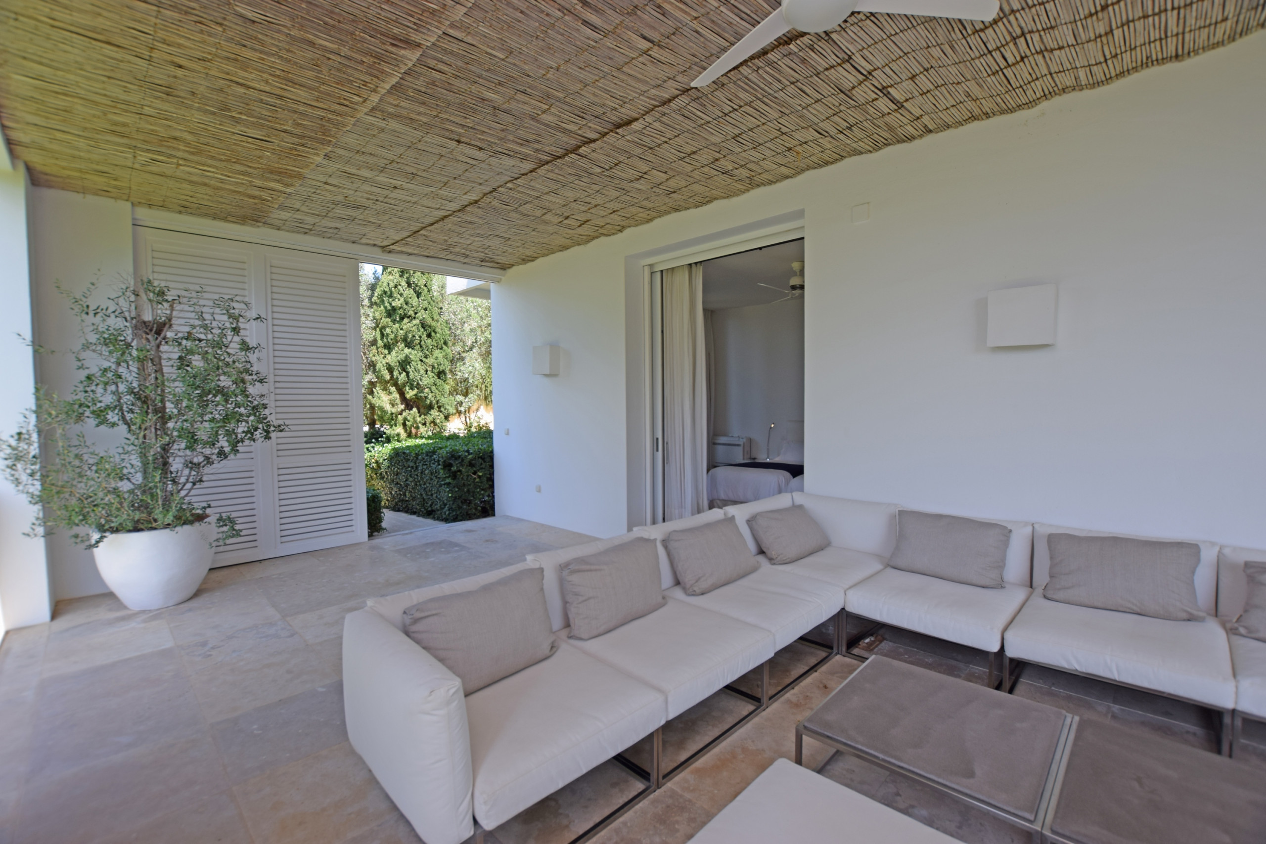 En el ala Oeste de la vivienda encontramos un pasillo acristalado que da acceso a la izquierda al porche y al fondo a una zona independiente de la vivienda con tres habitaciones dobles, una de ellas con baño en-suite y las otras dos con baño compartido completamente equipado. El porche puede cerrarse gracias a unos toldos verticales instalados en los tres arcos de acceso a la zona de piscina; el amplio espacio ofrece múltiples oportunidades para su distribución y funcionalidad.