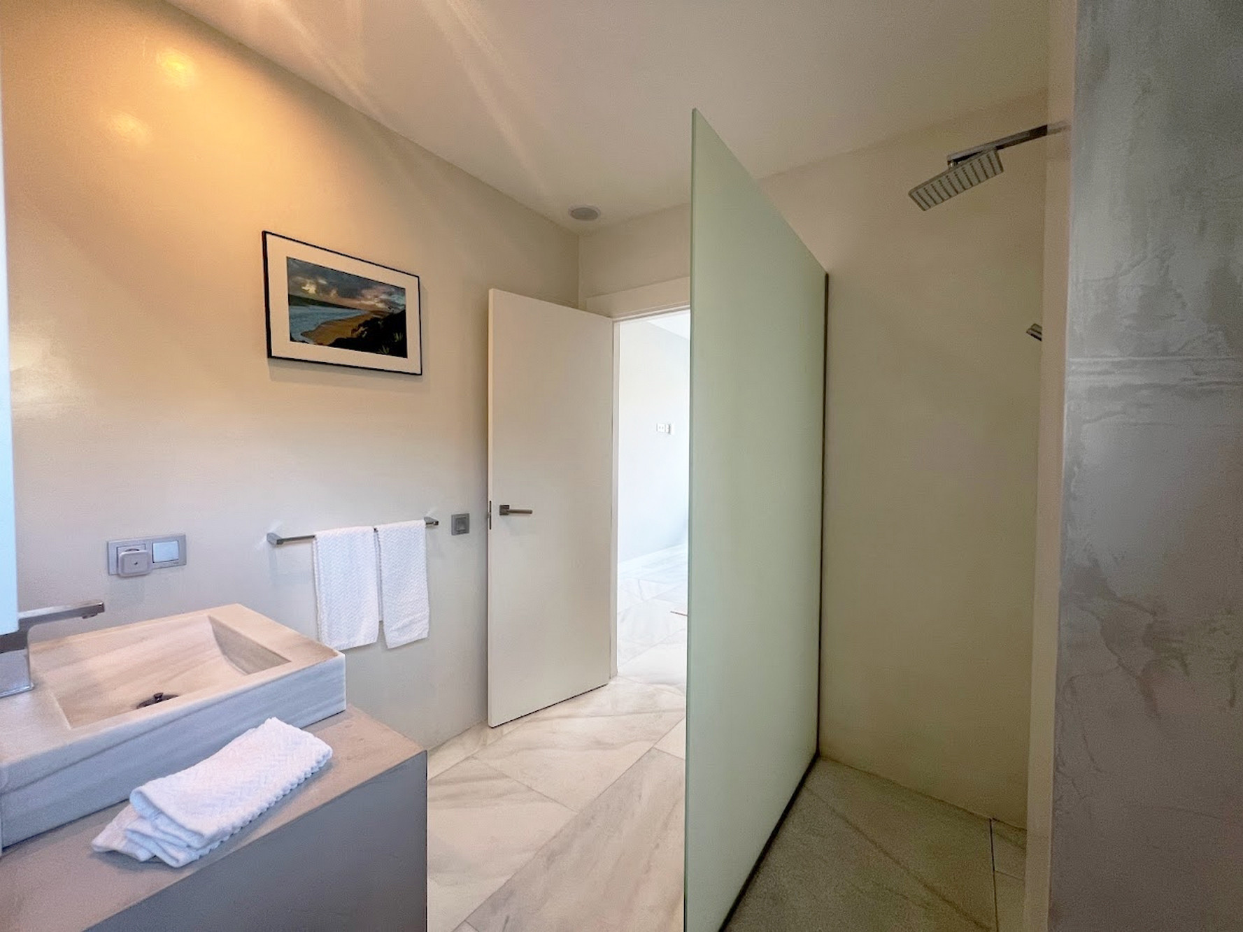 De vuelta en el interior, la blanca escalera con pasamanos acristalado nos lleva a la planta de descanso de Villa Entrefaros. Las vistas al mar nos acompañan desde que ponemos pie en este segundo nivel de la propiedad, tanto en la terraza que encontramos a mano derecha, como en el propio hall que distribuye la planta. El recibidor ya hace apetecible pasar tiempo en este área de la casa y nos dirige hacia dos habitaciones dobles, ambas con baño en-suite y acceso a una espléndida terraza compartida.