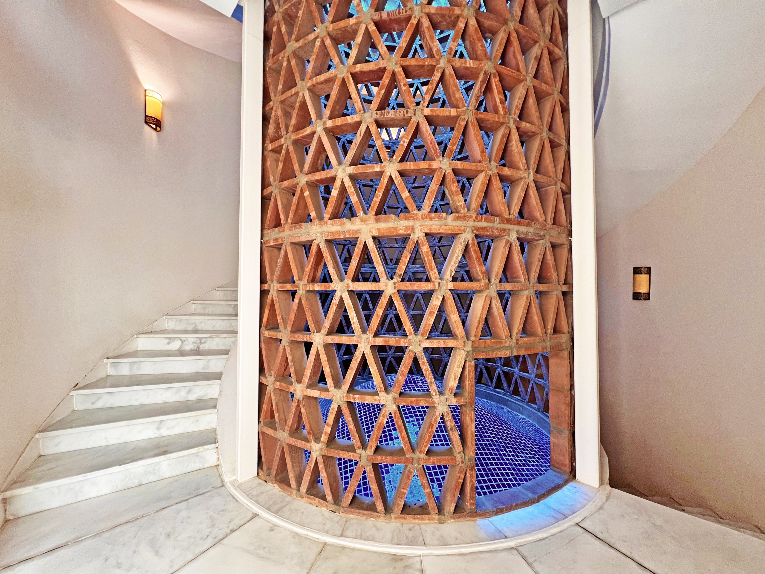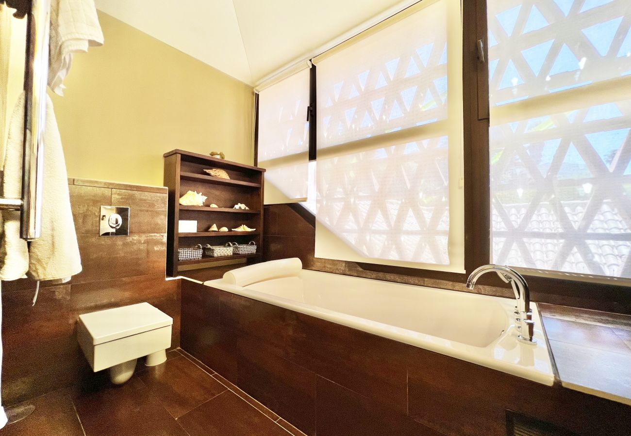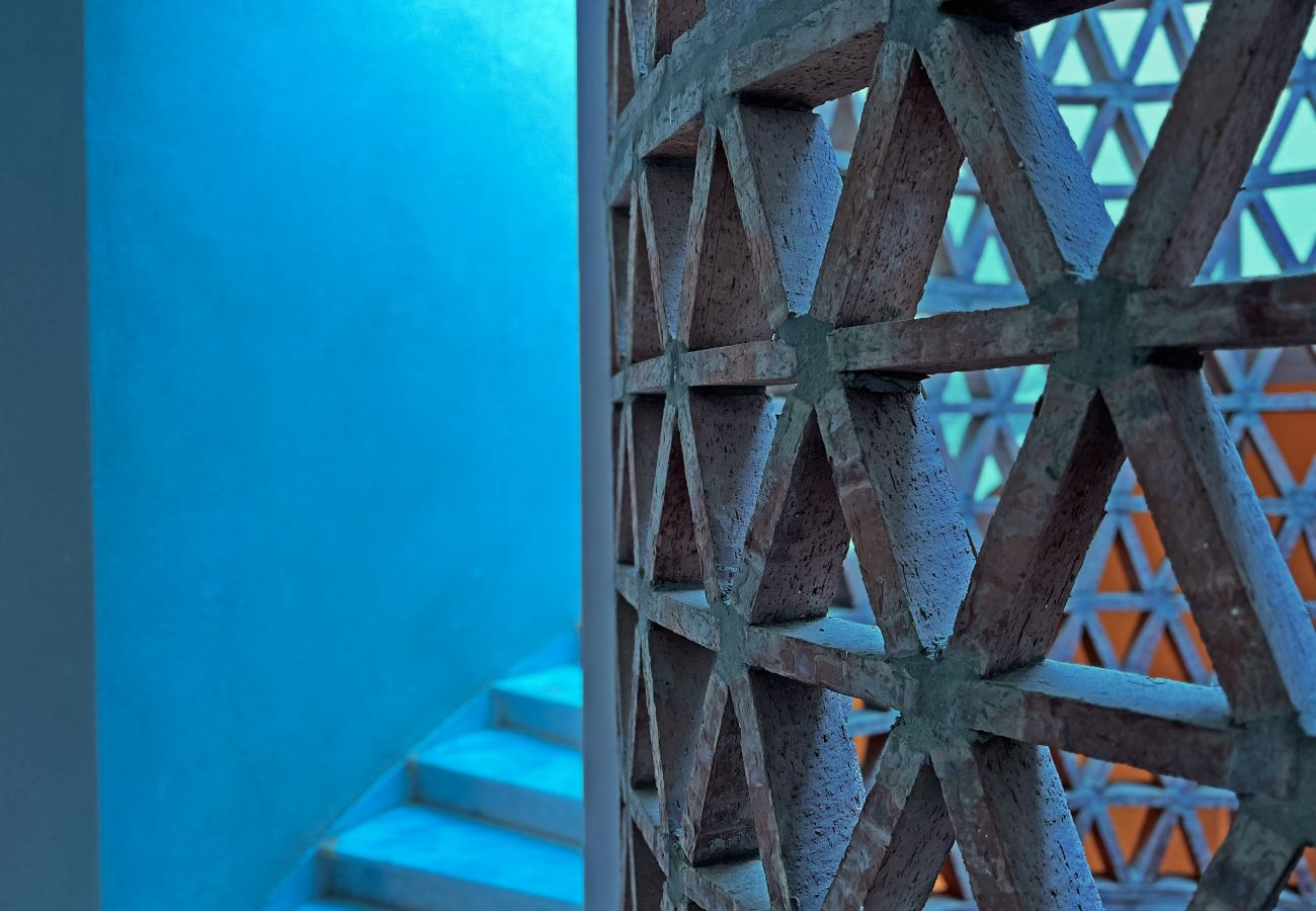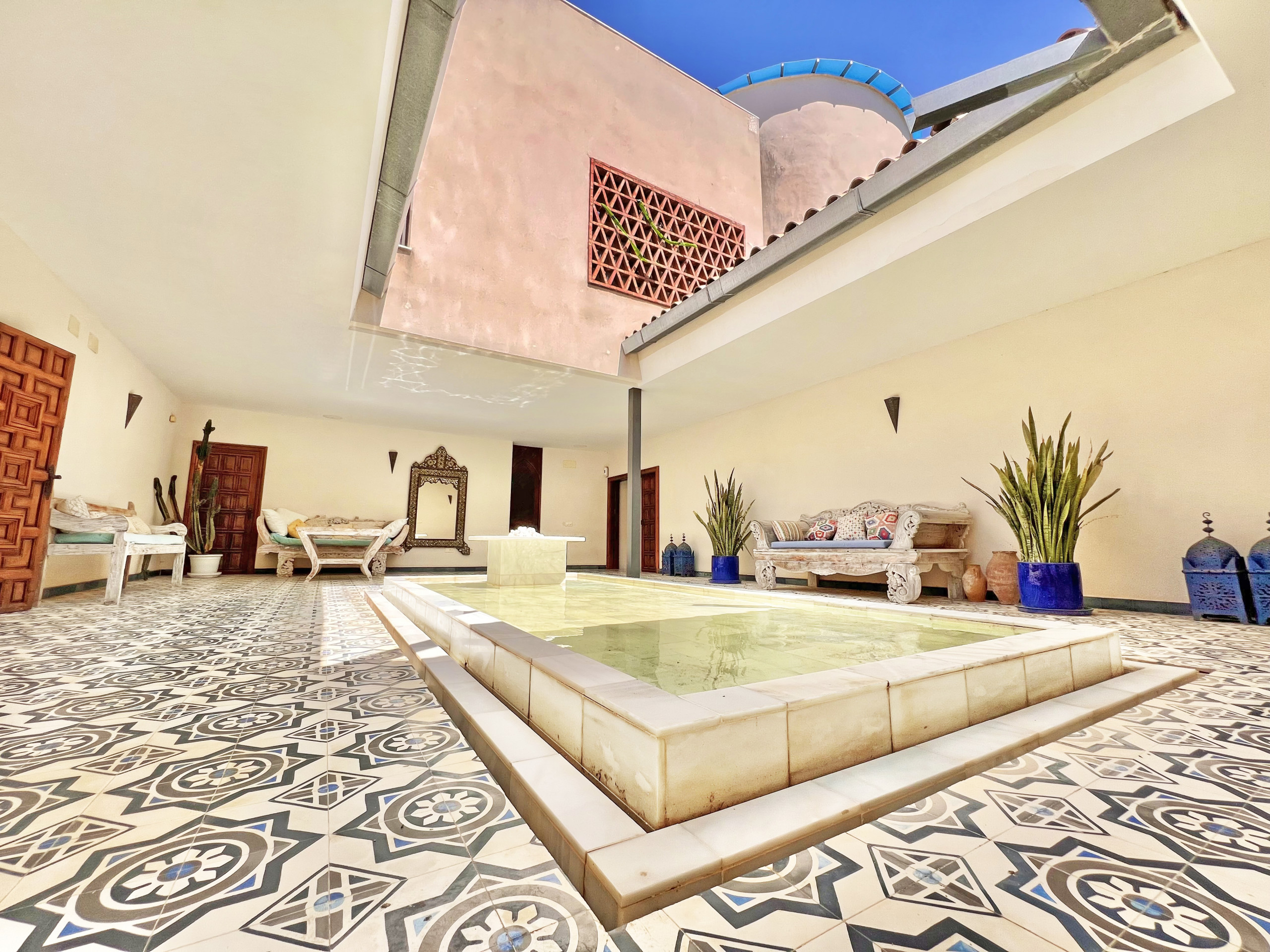 Al acceder a la propiedad, ingresamos a una zona privada compartida solo con otra villa, lo que garantiza una agradable privacidad desde el primer momento. A través de la imponente y sólida puerta de madera de la entrada, nos encontramos con una de las joyas de esta villa: un luminoso patio central con una fuente y un techo abierto que conecta las diferentes áreas de la casa.