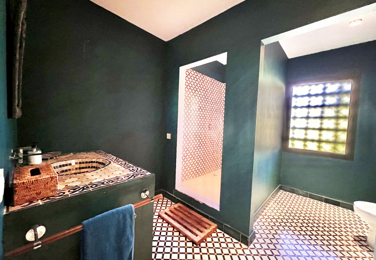 A la derecha, encontramos dos accesos diferentes a la zona de habitaciones. Desde el patio, una puerta nos conduce a dos habitaciones de estilo moruno y un baño completo con ducha. Una de las habitaciones cuenta con una cama individual y la otra con una cama de matrimonio.
