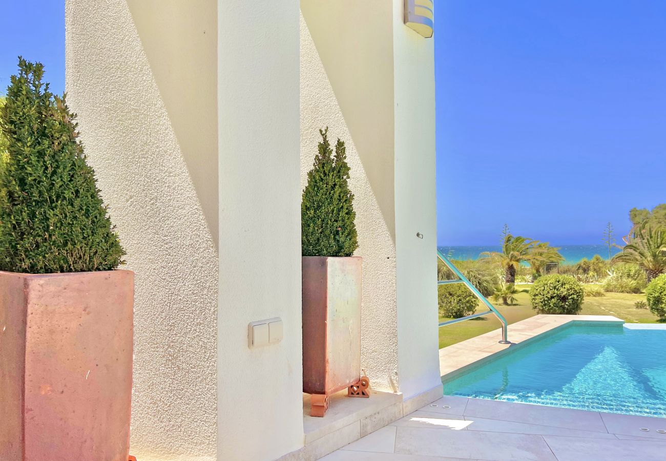 Este jardín de ensueño envuelve la villa en su planta inferior, perfectamente cuidado, con cenador exterior, zona de duchas exteriores y salida directa a un camino que accede a través de un camino a la playa.