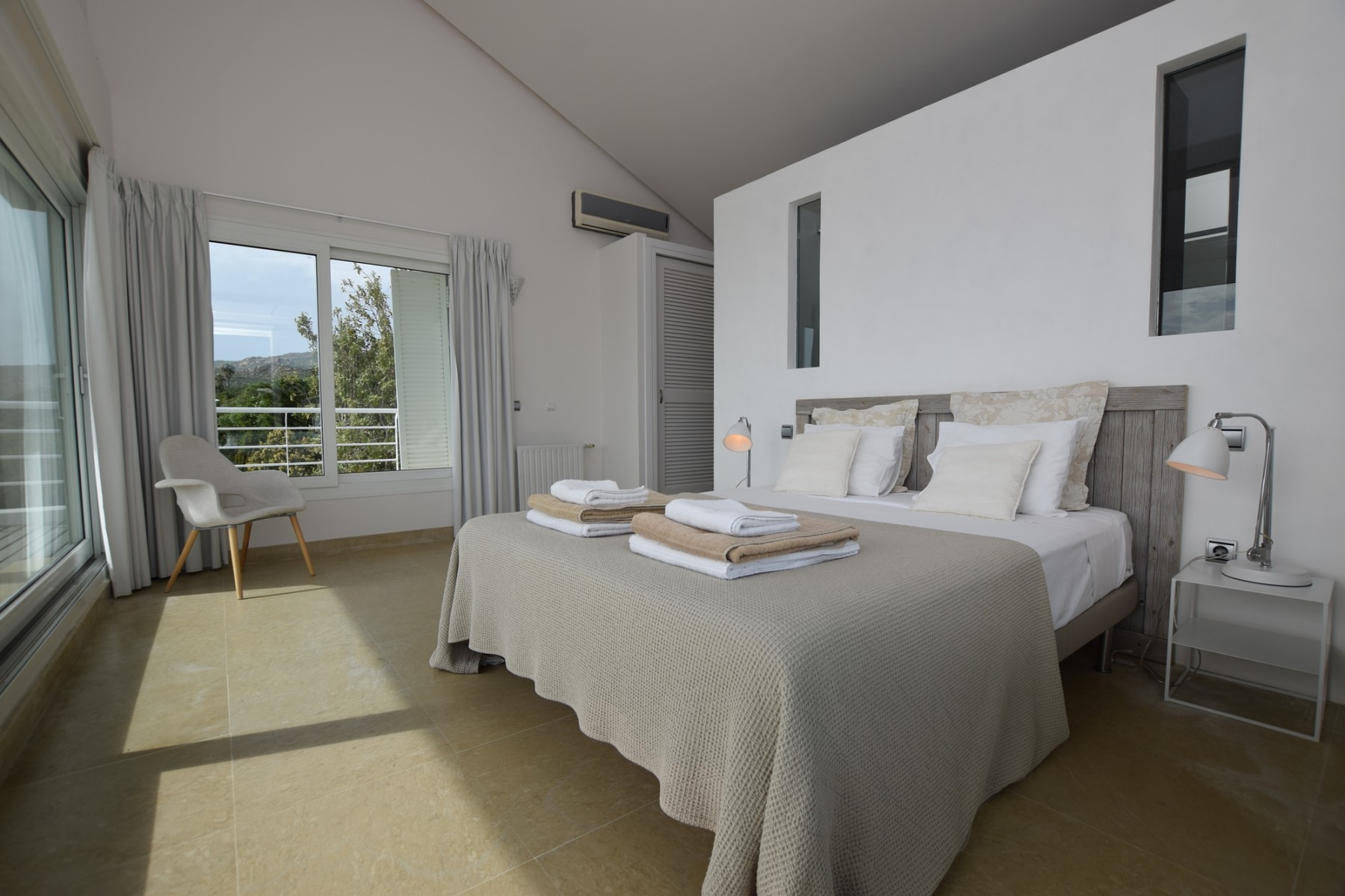 Eleganz und Natur in Harmonie. Das Obergeschoss der Villa beherbergt vier Schlafzimmer, zwei davon mit Badezimmer en suite, während die anderen beiden ein designtes Badezimmer teilen. Die riesigen Glasfronten, die dieses Stockwerk dominieren, bieten spektakuläre Ausblicke: auf der einen Seite das Meer und auf der anderen eine Steinmole, die mit Bougainvilleen und Jasmin geschmückt ist und von Obstbäumen umgeben ist. Wachen Sie jeden Morgen mit der Meeresbrise und dem Gefühl auf, im Freien zu schlafen, dank der großen Fenster, die sich vollständig öffnen lassen.