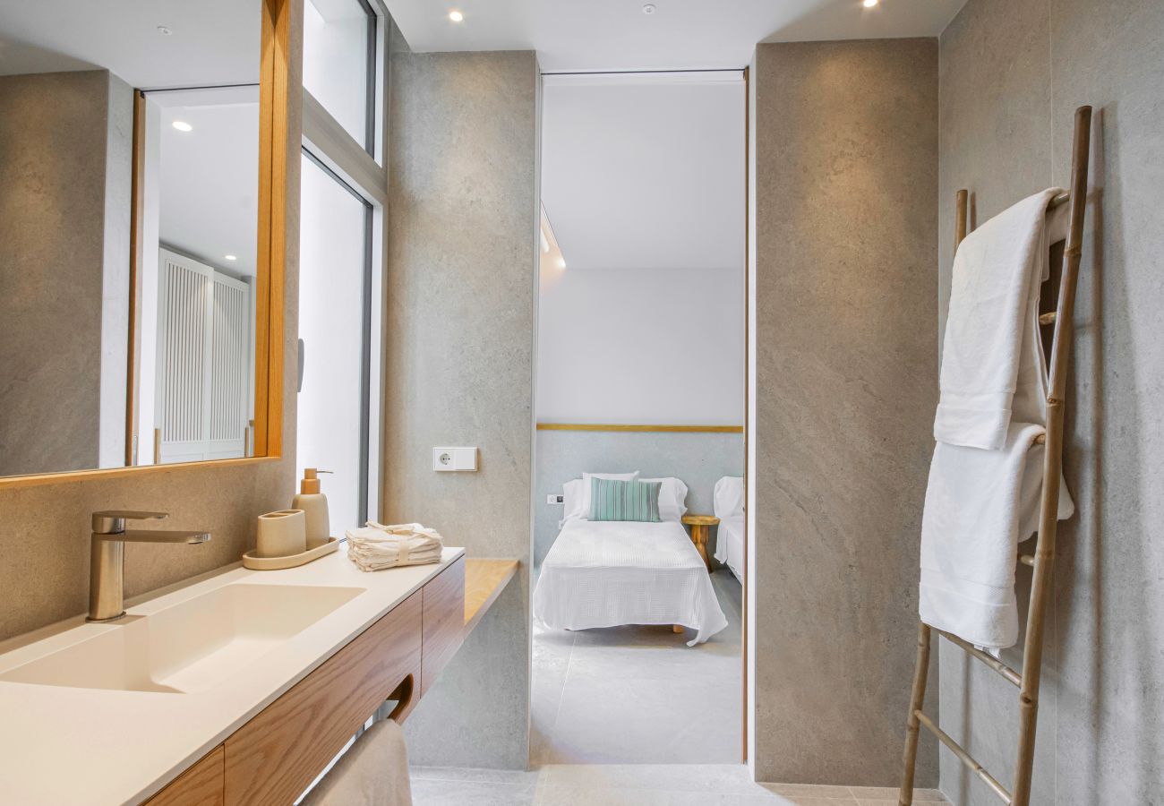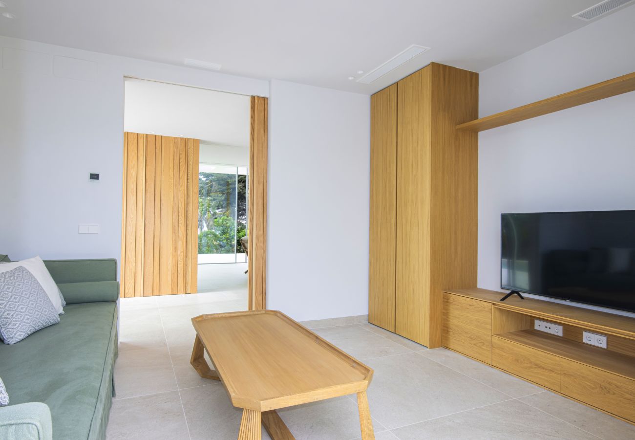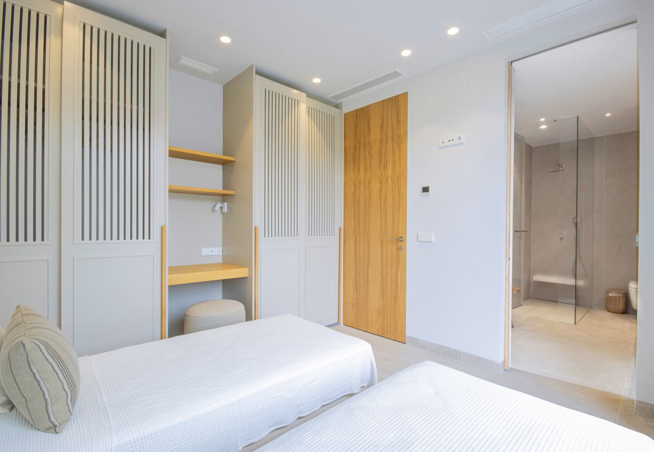 Auf der unteren Etage befinden sich insgesamt 5 große Schlafzimmer, alle mit Panoramablick auf das Meer, jedes mit einem kompletten Badezimmer (eines dieser Badezimmer verbindet zwei der Zimmer durch eine Dusche und zwei Waschbecken durch eine Glastür). Drei Schlafzimmer mit Doppelbetten und die anderen zwei mit zwei 90 cm breiten Betten, die zusammengestellt oder getrennt werden können, alle mit großen Terrassen, viel Privatsphäre und exquisitem Design. Auch auf dieser Etage finden wir einen Abstellraum, einen Pool-Maschinenraum und eine Waschküche.