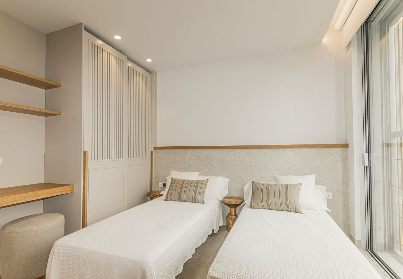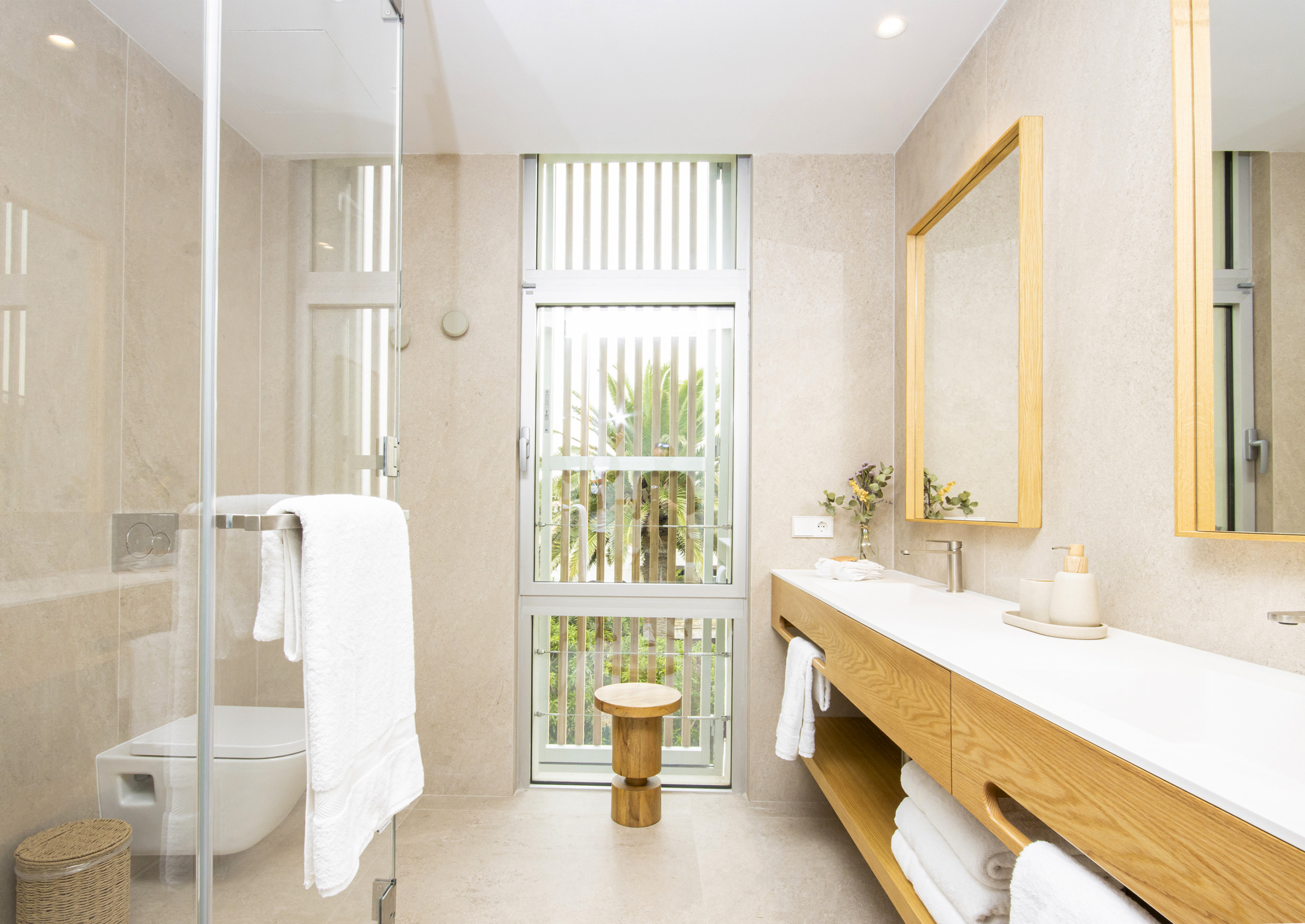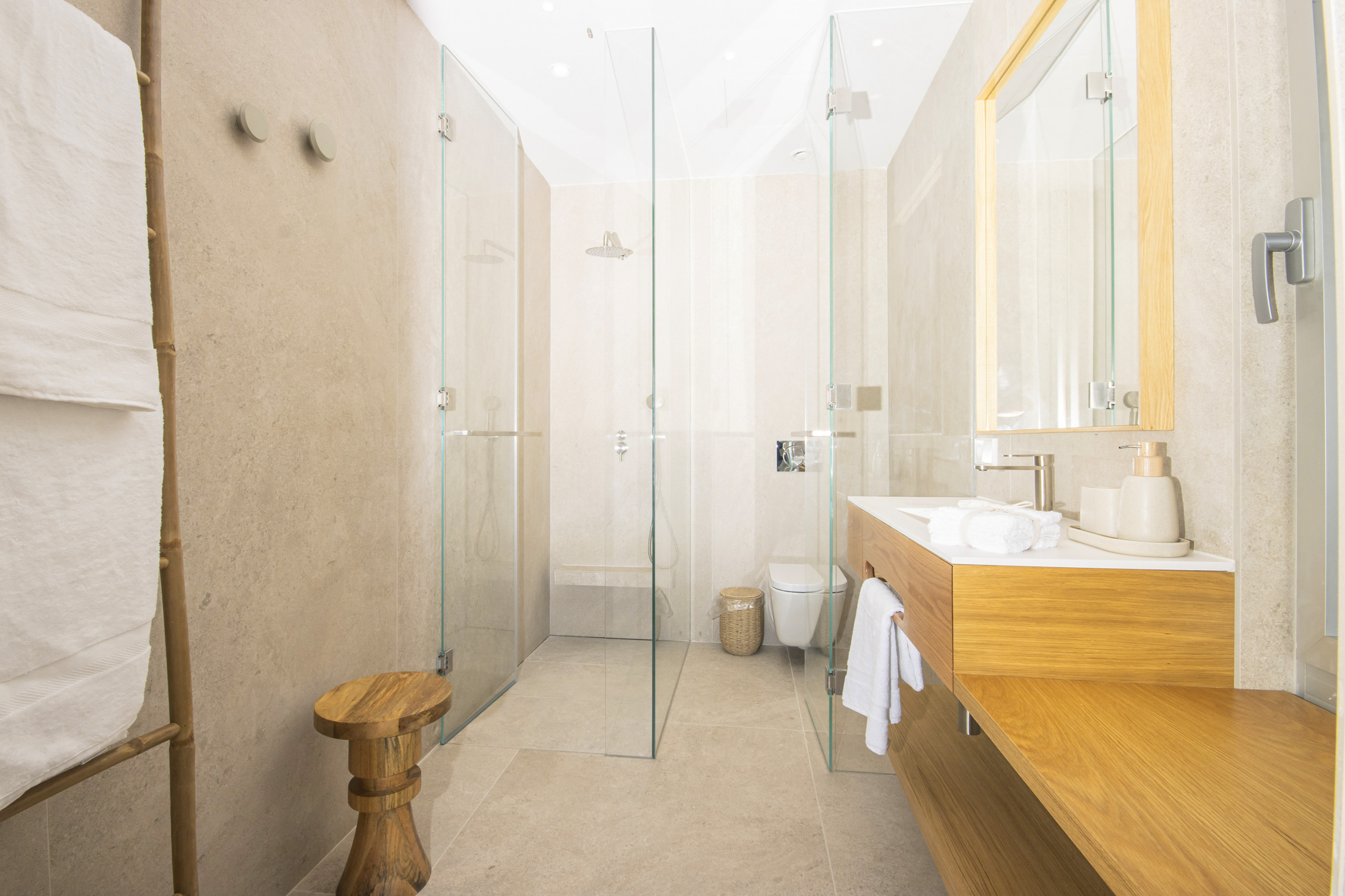 Auf der unteren Etage befinden sich insgesamt 5 große Schlafzimmer, alle mit Panoramablick auf das Meer, jedes mit einem kompletten Badezimmer (eines dieser Badezimmer verbindet zwei der Zimmer durch eine Dusche und zwei Waschbecken durch eine Glastür). Drei Schlafzimmer mit Doppelbetten und die anderen zwei mit zwei 90 cm breiten Betten, die zusammengestellt oder getrennt werden können, alle mit großen Terrassen, viel Privatsphäre und exquisitem Design. Auch auf dieser Etage finden wir einen Abstellraum, einen Pool-Maschinenraum und eine Waschküche.