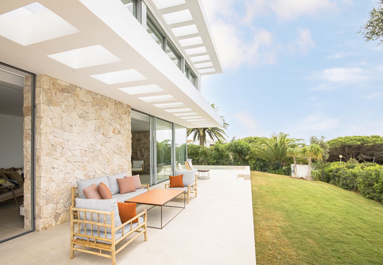 Auf einer großen Plattform (ein Grundstück von 2.690 m2 und eine bebaute Fläche von 700 m2), die nach Süden ausgerichtet ist, wird es über den steilen Hang hinaus in durchsichtige und transparente Räume projiziert, mit verglasten Abschnitten und durch Mittel stark vor direkter Sonneneinstrahlung geschützt von großen Flügen, sowohl drinnen als auch draußen. Hier finden wir die Räume für den täglichen Gebrauch, ein prächtiges Wohnzimmer, das mit den verschiedenen Räumen verbunden ist; eine wunderbare Küche mit Geräten von Gaggenau Professional und eine große zentrale Kochinsel mit tadelloser Ausstattung, mit einem Bulthaup B3-Keramikkochfeld und einem Teppan-Yaki-Kochfeld, hier sorgt das Weiß der Möbel und der Arbeitsplatte für große Klarheit, alles gemischt mit dem authentischen Boden aus gebranntem Ton, der es gibt Wärme und Komfort; Studieren mit Heimkino; Sauberkeit; Aktie; Fitnessstudio, ausgestattet mit Geräten von Hammeer Strentgh und Life Fitness, mit freiem Blick auf das Meer, mit einem Übungsbereich im Freien, einem Solarium und an einem Ende einem beeindruckenden beheizten Infinity-Pool mit Salzchlorierung.