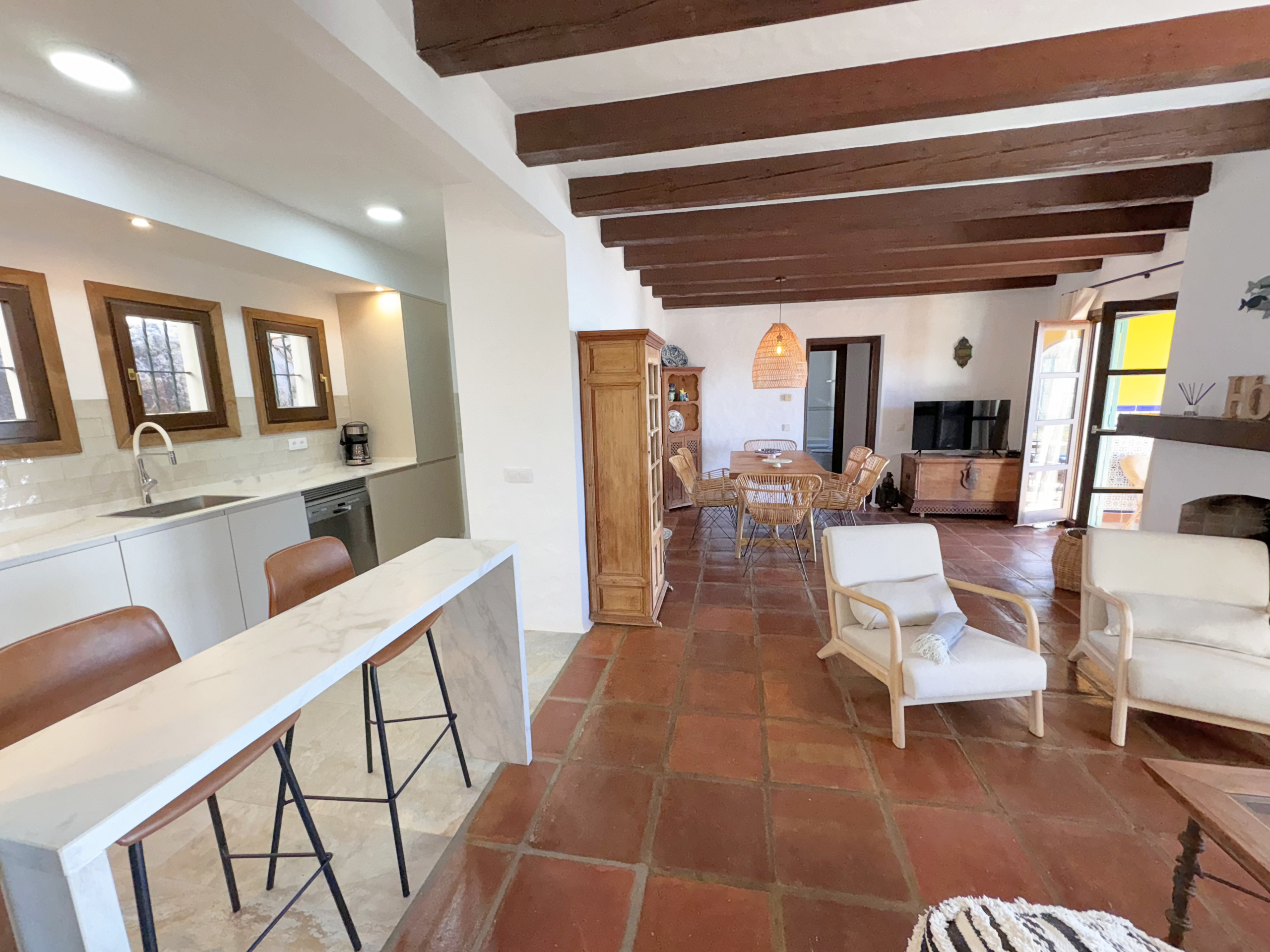 Wenn wir das Anwesen betreten, finden wir in seiner Aufteilung: Wohn-Esszimmer mit Kamin, voll ausgestattete Küche mit Speisekammer und Waschraum, zwei vollständige Badezimmer. Zusätzlich drei Doppelzimmer. Eines davon mit einem Bett von 180 cm und einem En-Suite-Badezimmer, ein anderes mit einem Bett von 150 cm und das dritte mit zwei Einzelbetten von 90 cm.