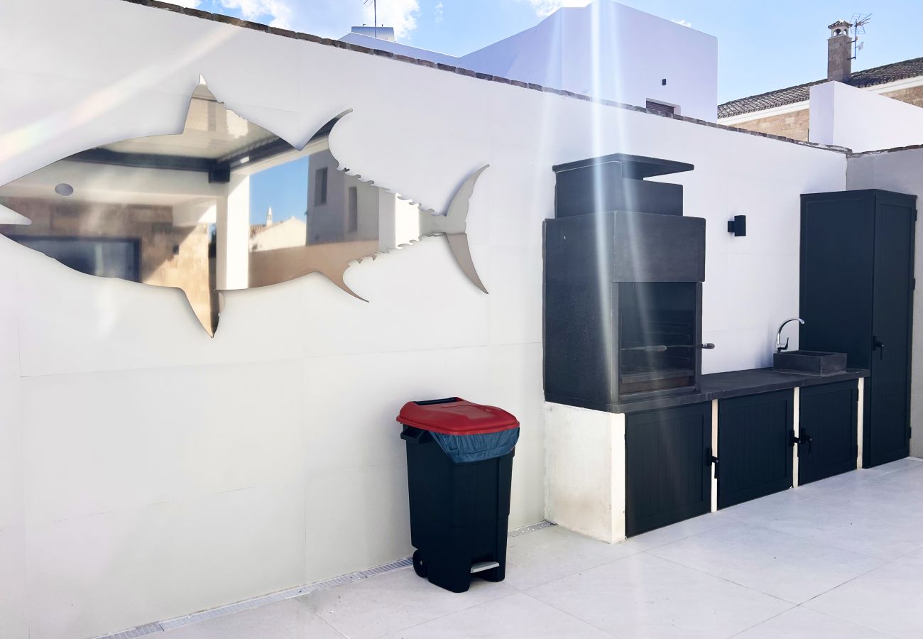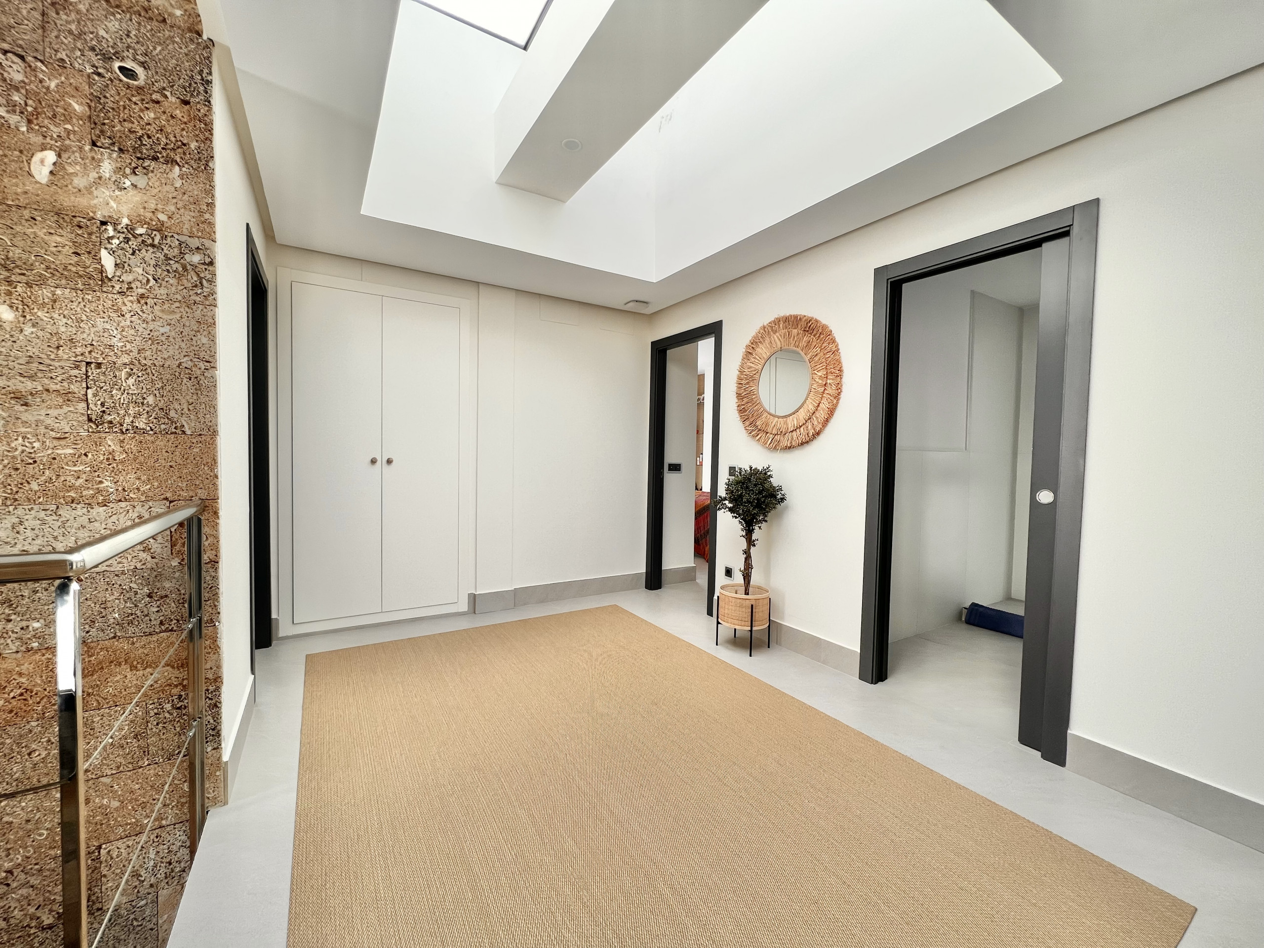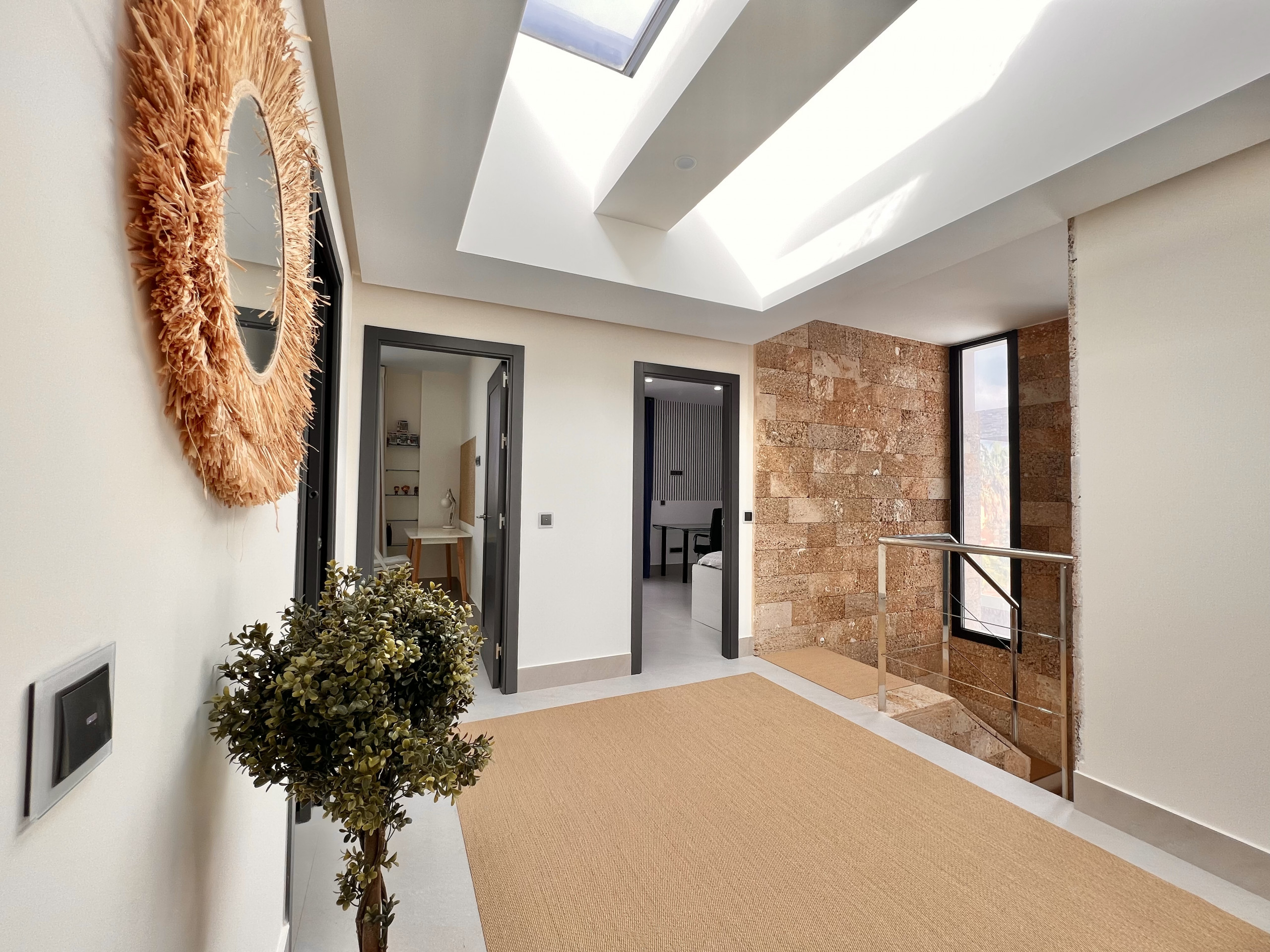 Vom Wohnzimmer aus gelangen wir über eine elegante Holztreppe mit Wänden aus Muschelkalkstein in das erste Obergeschoss. Das Erste, was wir beim Hochsteigen antreffen, ist ein Flur, der dank einer großen Dachöffnung in natürliches Licht getaucht ist. Von hier aus gelangt man zu den vier anderen Schlafzimmern der Immobilie. Zwei Schlafzimmer mit einem Einzelbett, ein drittes mit zwei Einzelbetten und das Hauptschlafzimmer mit einem En-Suite-Bad und Zugang zu einer großen, sonnigen Terrasse mit Blick auf den Poolbereich. Zu dieser Terrasse hätte auch das Schlafzimmer mit zwei Einzelbetten Zugang, das zusätzlich ebenfalls ein En-Suite-Bad verfügt. Diese Etage verfügt über ein gemeinsames Badezimmer, das von den Einzelbettzimmern geteilt wird.