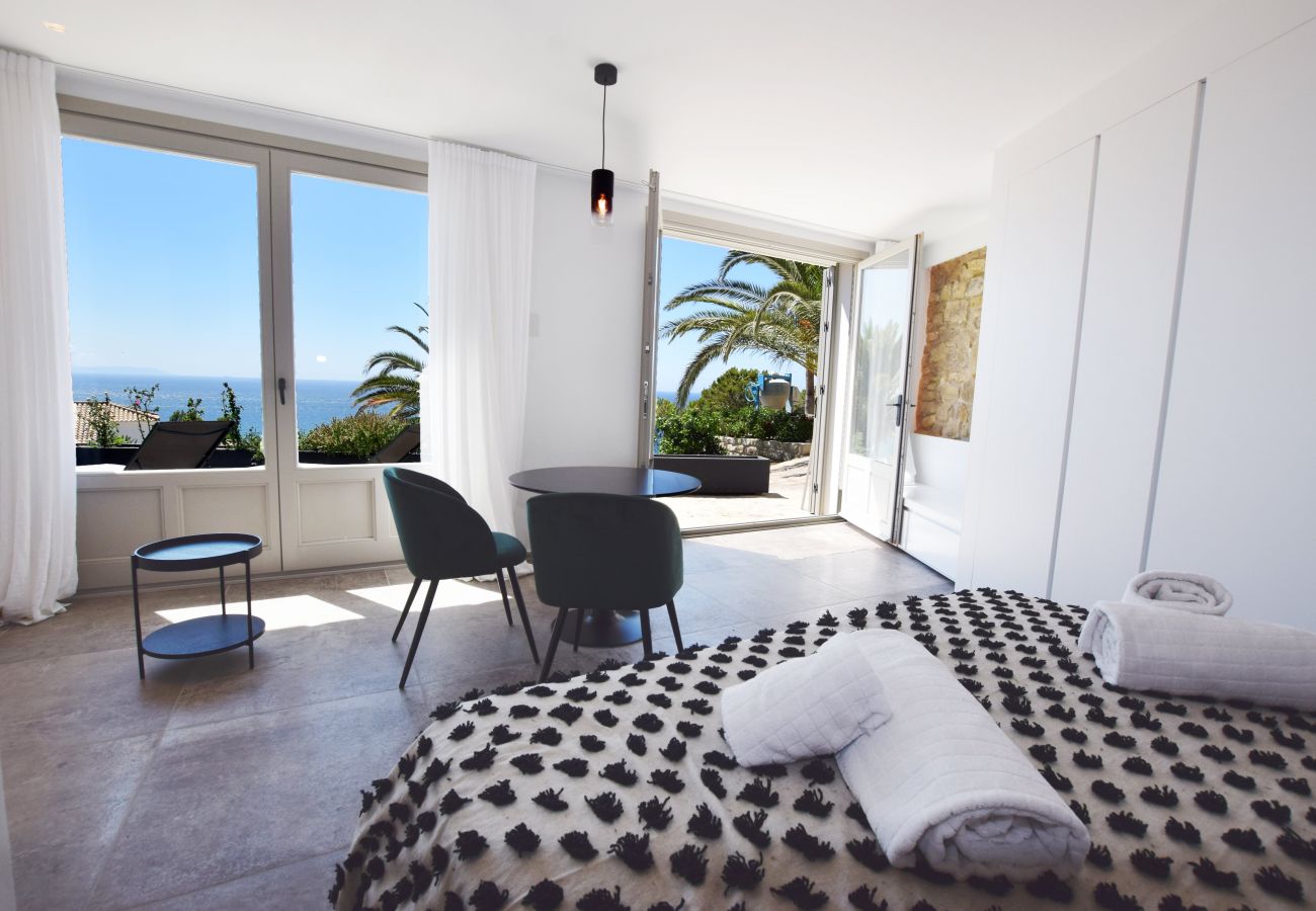Abschließend finden wir in der unteren Etage des von außen zugänglichen Poolbereichs das letzte Doppelzimmer mit Bad en Suite und Wohnbereich. Dieses Zimmer hat auch eine eigene Terrasse.