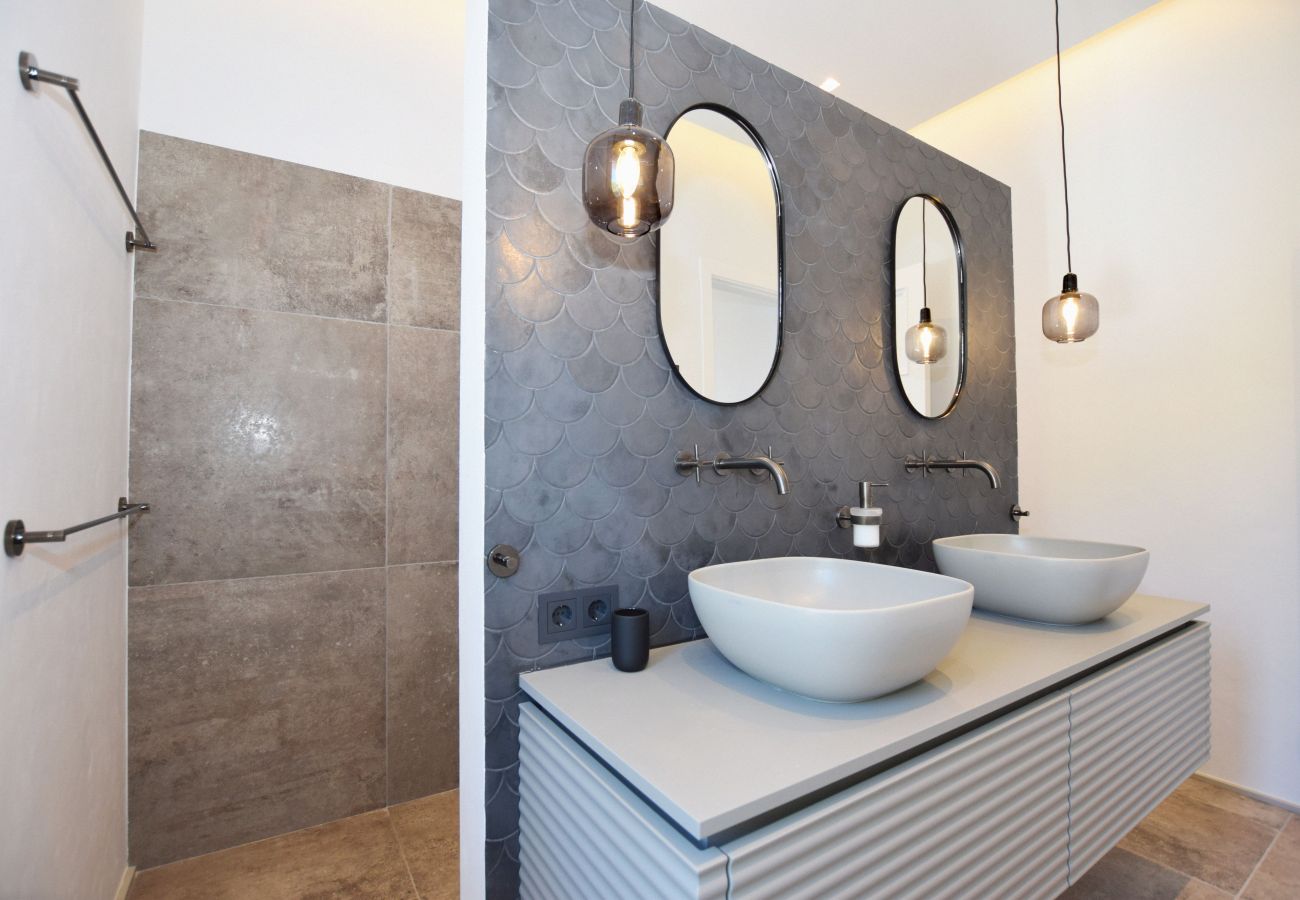In der rechten Etage beim Hinuntergehen der Treppe, hinter der Ess- und Küchenzone, finden wir einen Flur, der zu 2 Schlafzimmern führt, die sich direkt gegenüber der Schlafzimmer mit 2 Badezimmern mit Dusche befinden. Der Flur endet in einem Bereich, der der Gesundheit gewidmet ist: ein vollständig ausgestattetes Fitnessstudio mit hochwertigen Geräten und Zubehör. Dieser Wellnessbereich umfasst ein luxuriöses Badezimmer mit zwei Duschen und einer großen Sauna mit Meerblick. Neben dem Fitnessstudio gelangen wir über eine Treppe zum Hauptschlafzimmer, einer privaten Zuflucht, die für maximale Erholung konzipiert ist und eine Arbeitszone, Badezimmer mit Dusche, Badewanne, Ankleidezimmer und WC-Bereich umfasst.