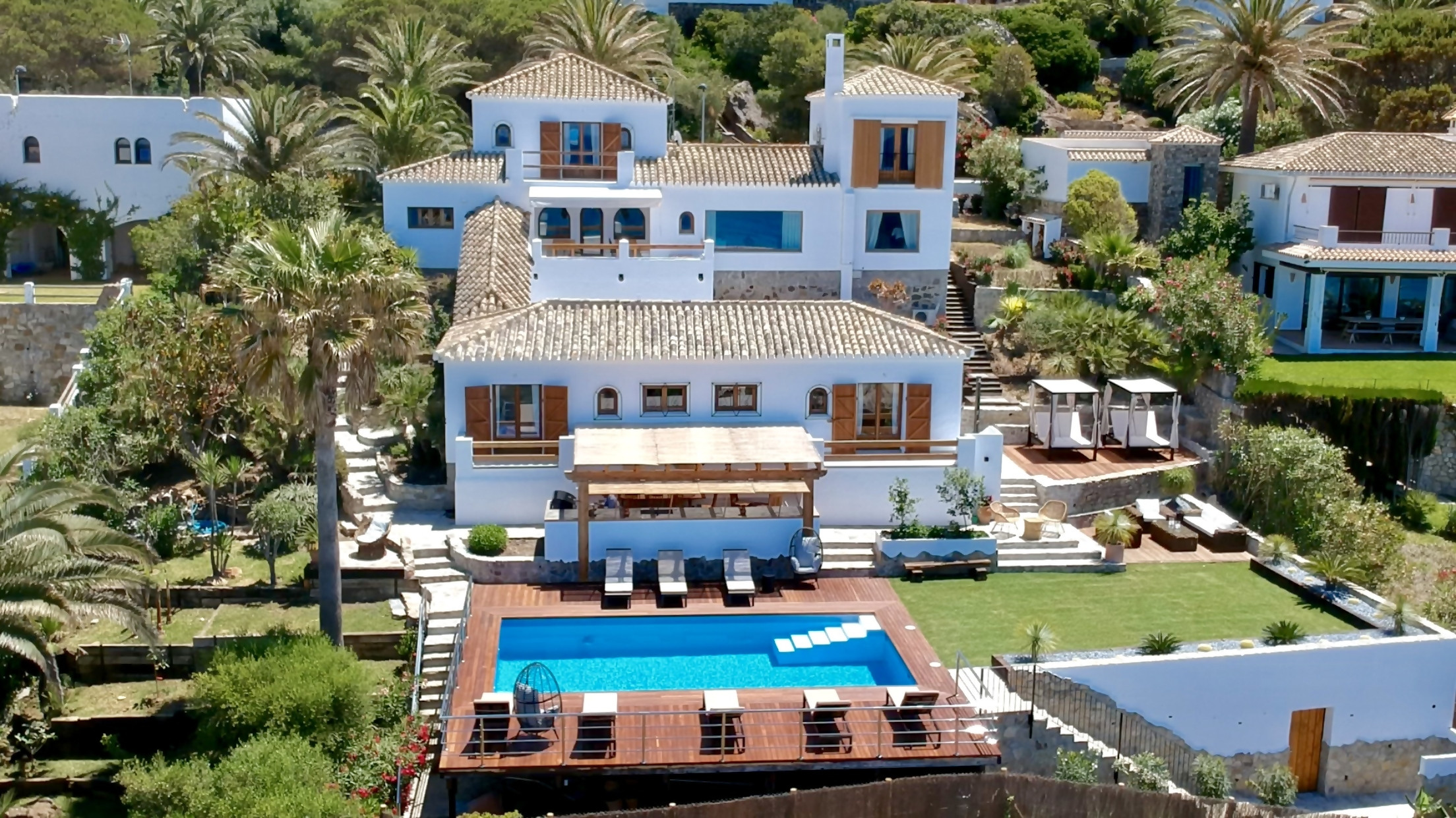 Its main features, in addition to its 2000m plot, include pleasant and cosy common areas, an impressive swimming pool, outdoor kitchen, spacious garden, direct beach access and views from virtually every room.