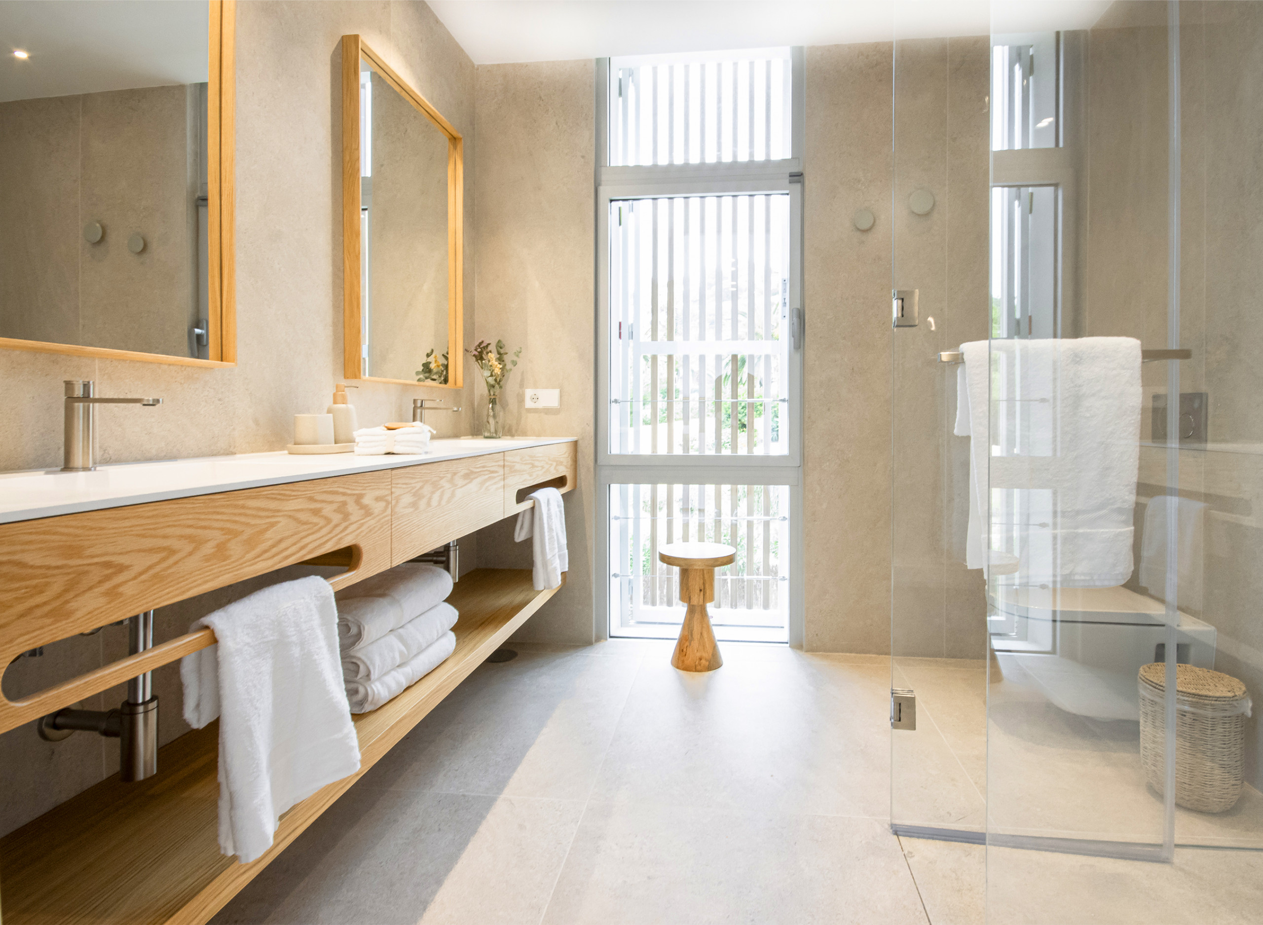 On the lower floor there are a total of 5 large bedrooms -all with panoramic views of the sea-. Except for two of the bedrooms that shared a double entry bathroom with a shower and two sinks, the rest of the bedrooms have their own fully equipped bathroom. Three of the double rooms have queen beds and the other two count with two single beds each -that can be joined together or left separated-. All five bedrooms are exquisitely designed, have large terraces and great privacy.