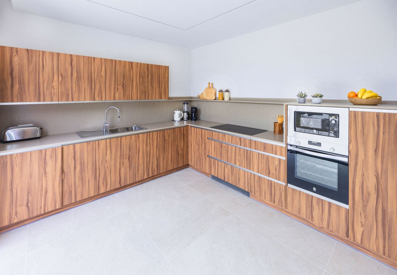 In the East wing from the entrance distributor, organised by a corridor, we come across a comfortable toilet, a laundry area, access to the small patio that leads to the exterior of the dwelling and, lastly, the fully equipped kitchen bathed in natural light. The kitchen shares the magnificent Japanese garden which gives spaciousness and luminosity to the space. From the kitchen, one can also access the dining area.