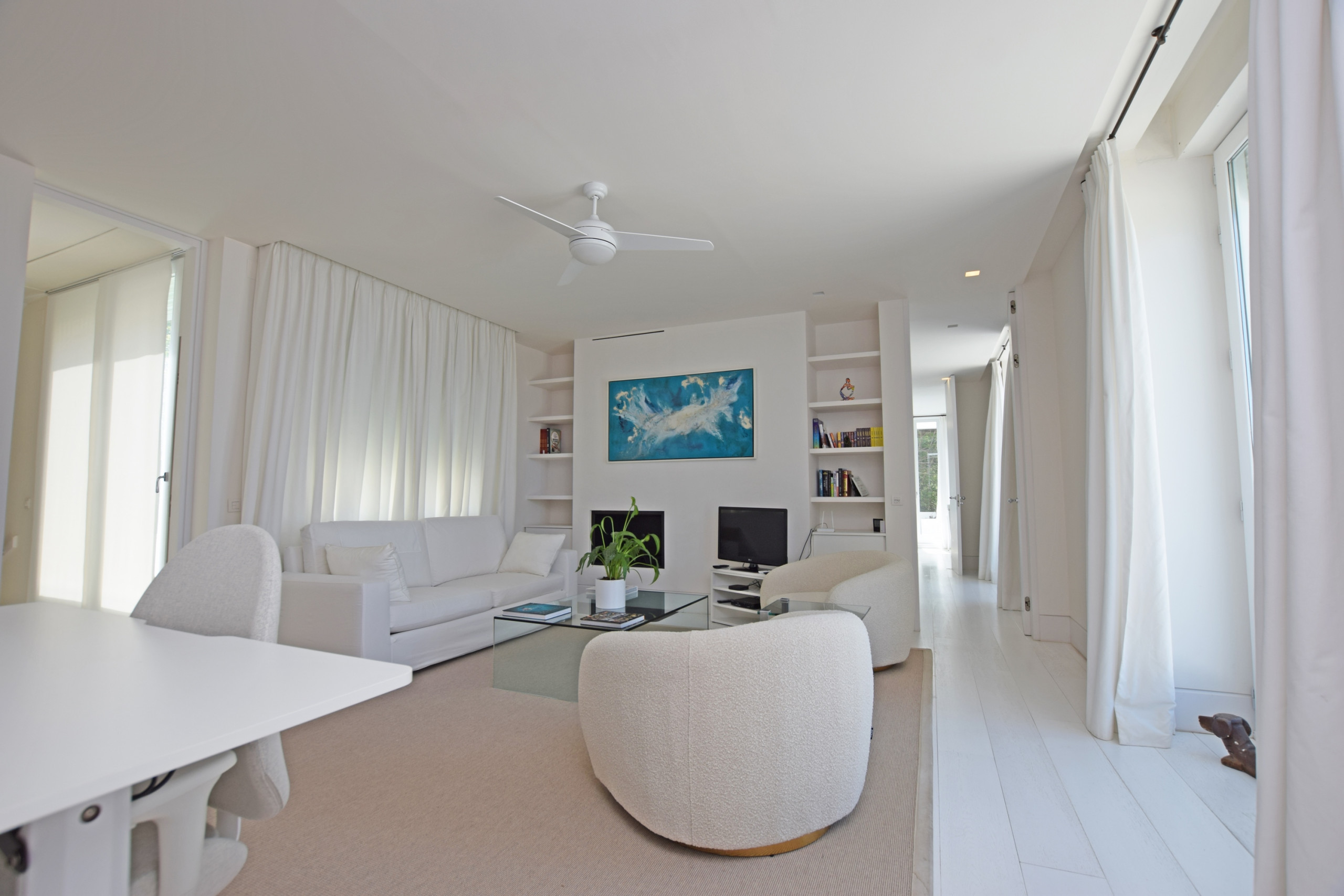 In the main area where daily life takes place, we find a magnificent living room that connects with the different bedrooms, a wonderful kitchen with Gaggenau Professional appliances and a large central island with impeccable equipment: a Bulthaup B3 ceramic hob and teppan yaki hob among others. The white of the furniture and counter-tops provide great clarity, all mixed with the original baked clay flooring that provides warmth and comfort. There is also a study with home cinema, a toilet, a storage room and a gym equipped with Hammeer Strentgh and Life Fitness machines with open views of the sea and an outdoor exercise area. As we walk outside in the main floor, we step into a solarium and can also find impressive heated salt water infinity pool.
