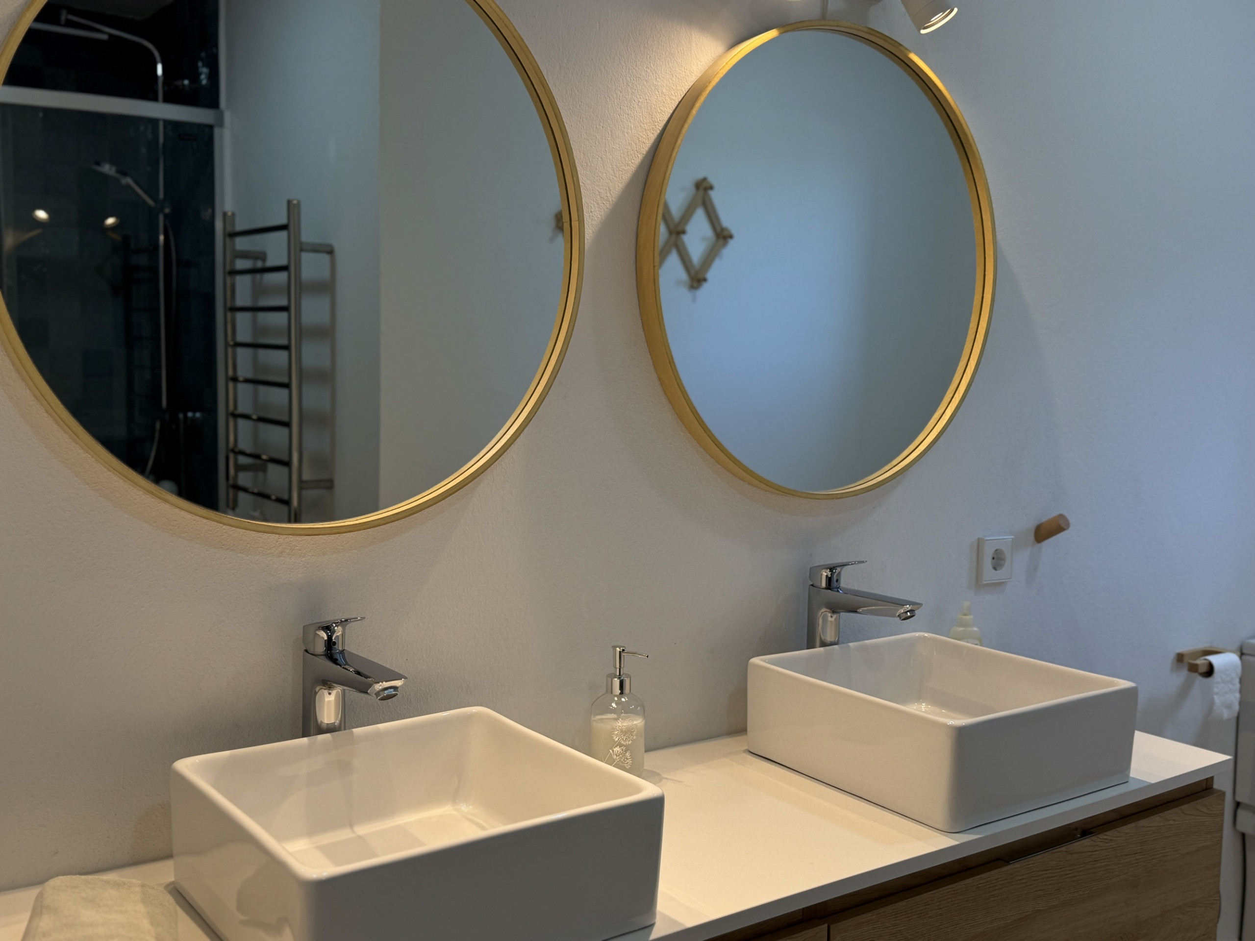 The main house is accessed through a spacious entrance hall with a toilet serving the common areas of the villa. From there, we move to a spacious open space where a large dining room is distributed, conditioned for 10 people, living area with fireplace in a warm and welcoming atmosphere, porch with outdoor furniture in the front area, and kitchen area, very well equipped, with laundry area, and LO'R coffee maker, ideal for preparing delicious breakfasts. At the rear, with direct exit from the living room, we find a gazebo with table and chairs outdoors, a very cool and pleasant area. In addition, on this floor there are three elegant double bedrooms (180 cm), each with an en-suite bathroom with shower. Two of these bedrooms have fans to keep a fresh environment on the hottest days.