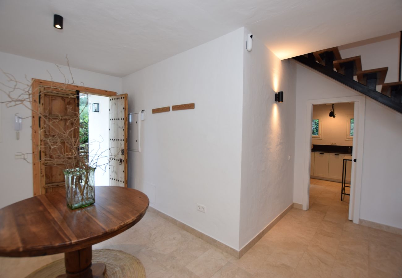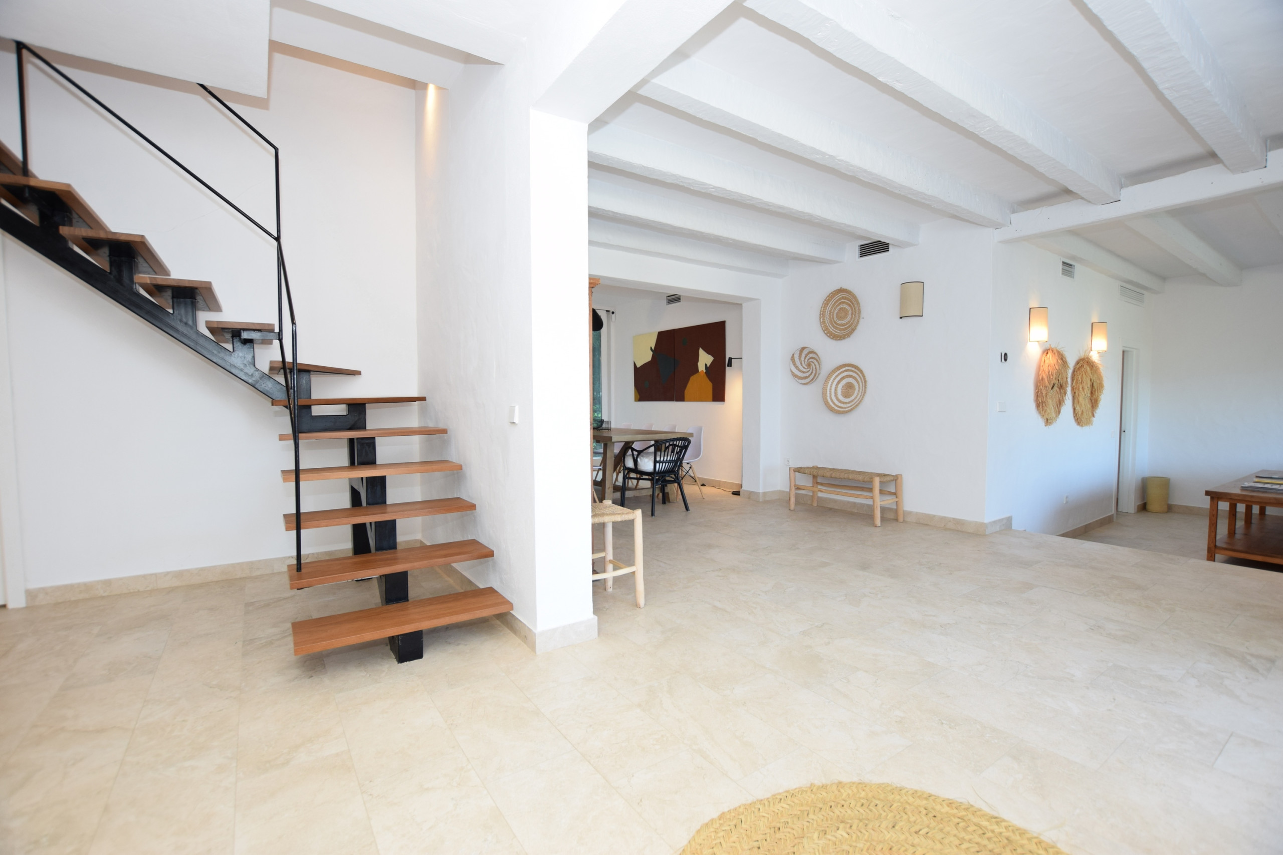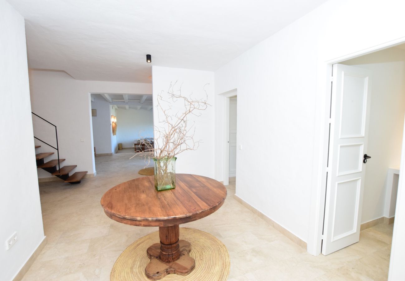 In its almost 3,000m2 plot, vegetation abounds, the green of its trees and the cacti that are so peculiar but add so much personality. The house, with a whitewashed facade, has 448m2 of built surface. We can access the dwelling from several points, as is logical, one of its accesses is the carefully tended entrance located at the rear of the house and whose main door already anticipates the character of the dwelling; another access is located on the side and leads inside through a small, bright courtyard. The third access is situated on the porch, at the front of the property and at the foot of the swimming pool.