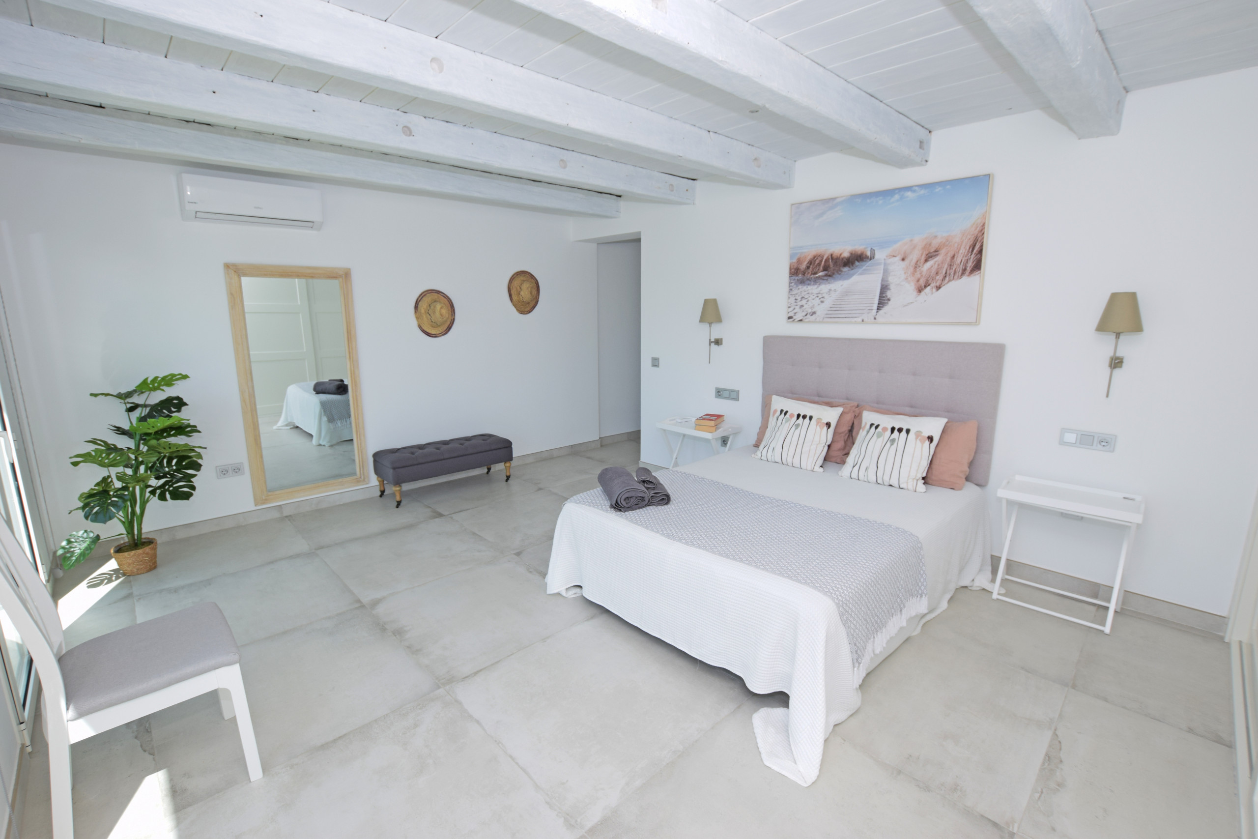 The main floor of the villa has a spacious open space where the living room-dining room-kitchen are located, with access to a pleasant outdoor porch with outdoor furniture where you can enjoy evenings outdoors within the peace and tranquillity that this environment will provide. It also has a large swimming pool, about 9 x 5 metres, with a stunning garden surrounded by palm trees. On this same floor we find 3 bedrooms with en-suite bathrooms with shower; two of these bedrooms with 2 single beds each and the third with a double bed. From this last bedroom you will enjoy pleasant views of the pool area and the sea.